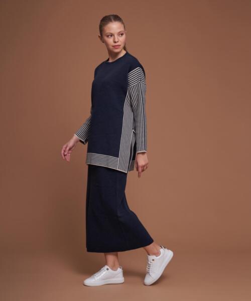 Knitwear Line Detailed Skirt Suit – Navy Blue – 14106