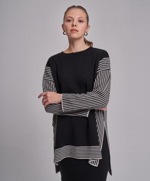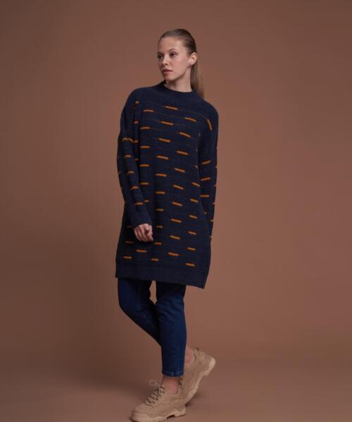 Knitwear Line Patterned Oversize Sweater – Navy Blue – 7083