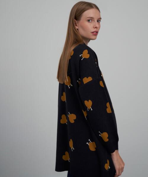 Heart Patterned V-Neck Oversize Sweater – Navy Blue – 14099