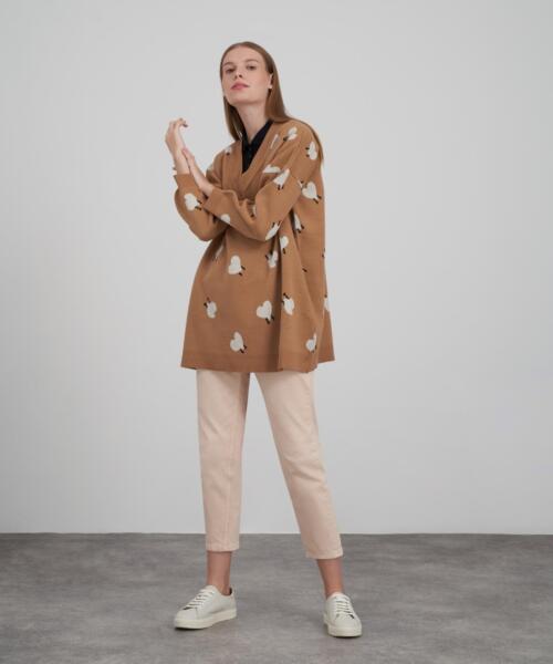 Heart Patterned V-Neck Oversize Sweater – Biscuit Color – 14099