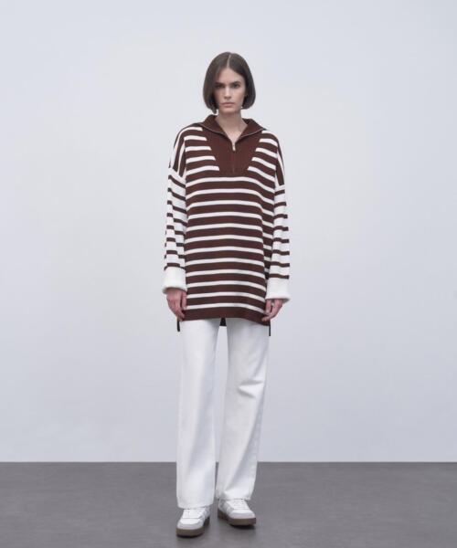 Striped Zipper Knitwear Sweater – Brown – 14140