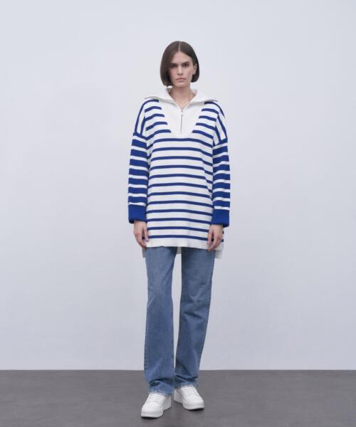Striped Zipper Knitwear Sweater – Navy Blue – 14140