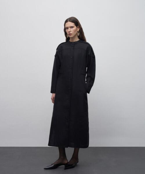 100% Linen Button Detailed Shirt Dress – Black – 24121