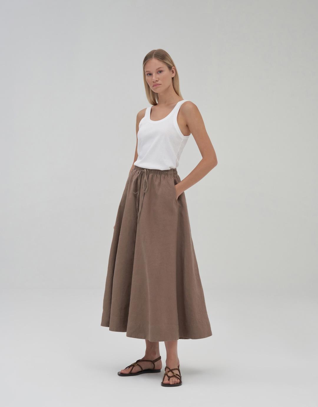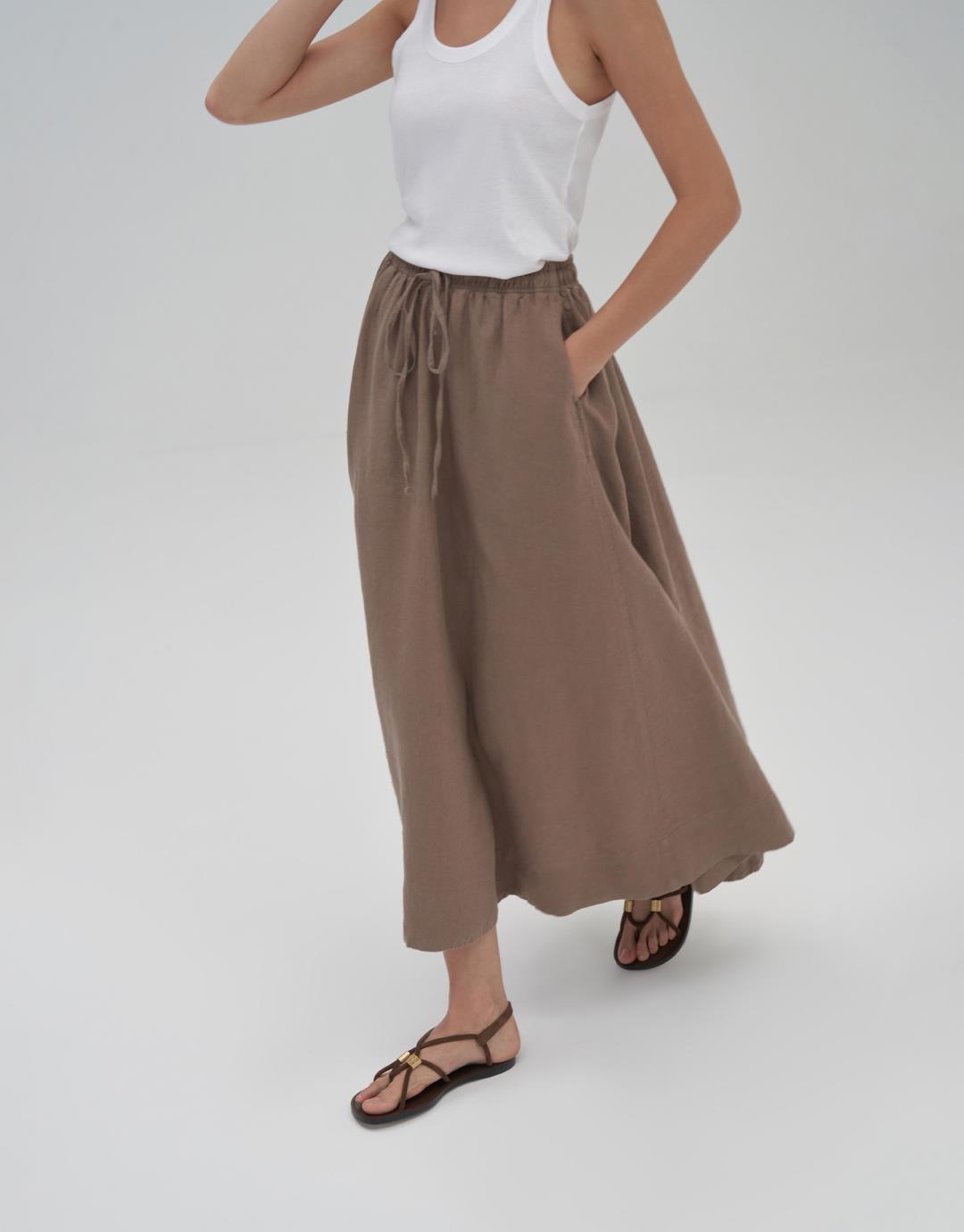 Fabric Content: 100% LINEN Product Details: Flywheel. Two side pockets. Adjustable drawstring waist. The hem has a wide frill folding detail. Model Size: 36 Model Height: 1.72 The product on the mannequin is size S/M. Usage and Washing Instructions: Tetrachlorethylene Dry Cleaning. Roller cleaning is not done. Tumble drying is not done. Bleach bleach is not used.
