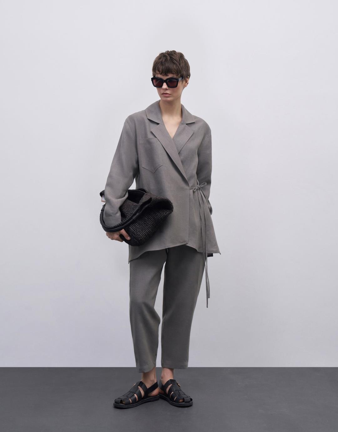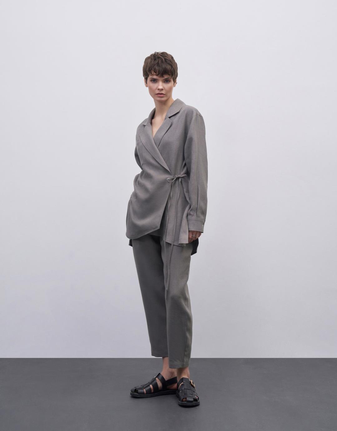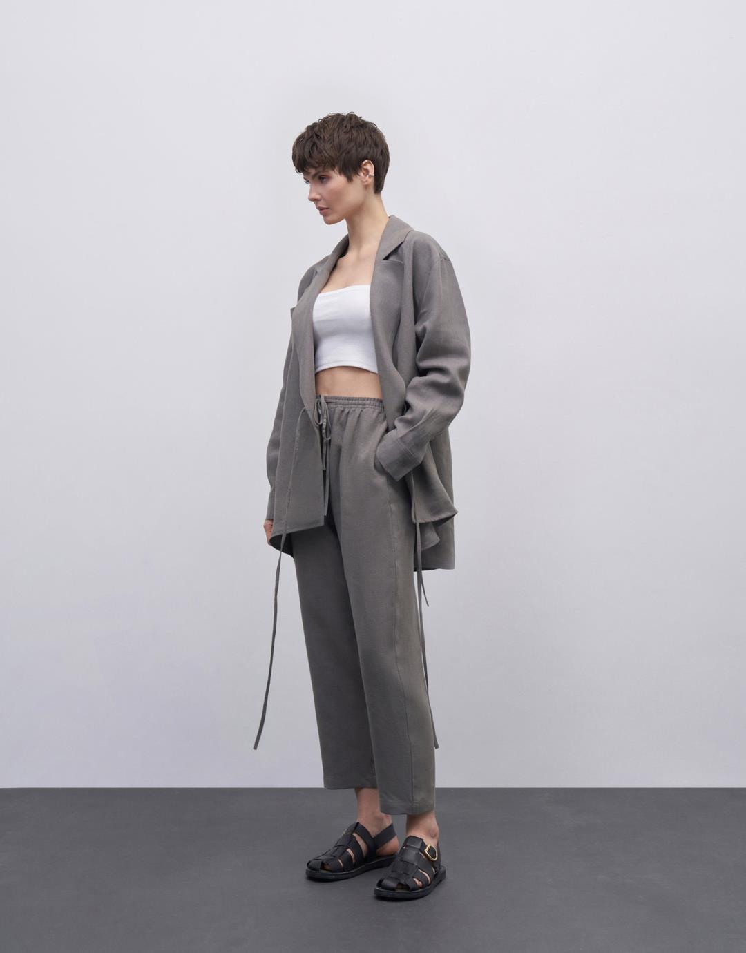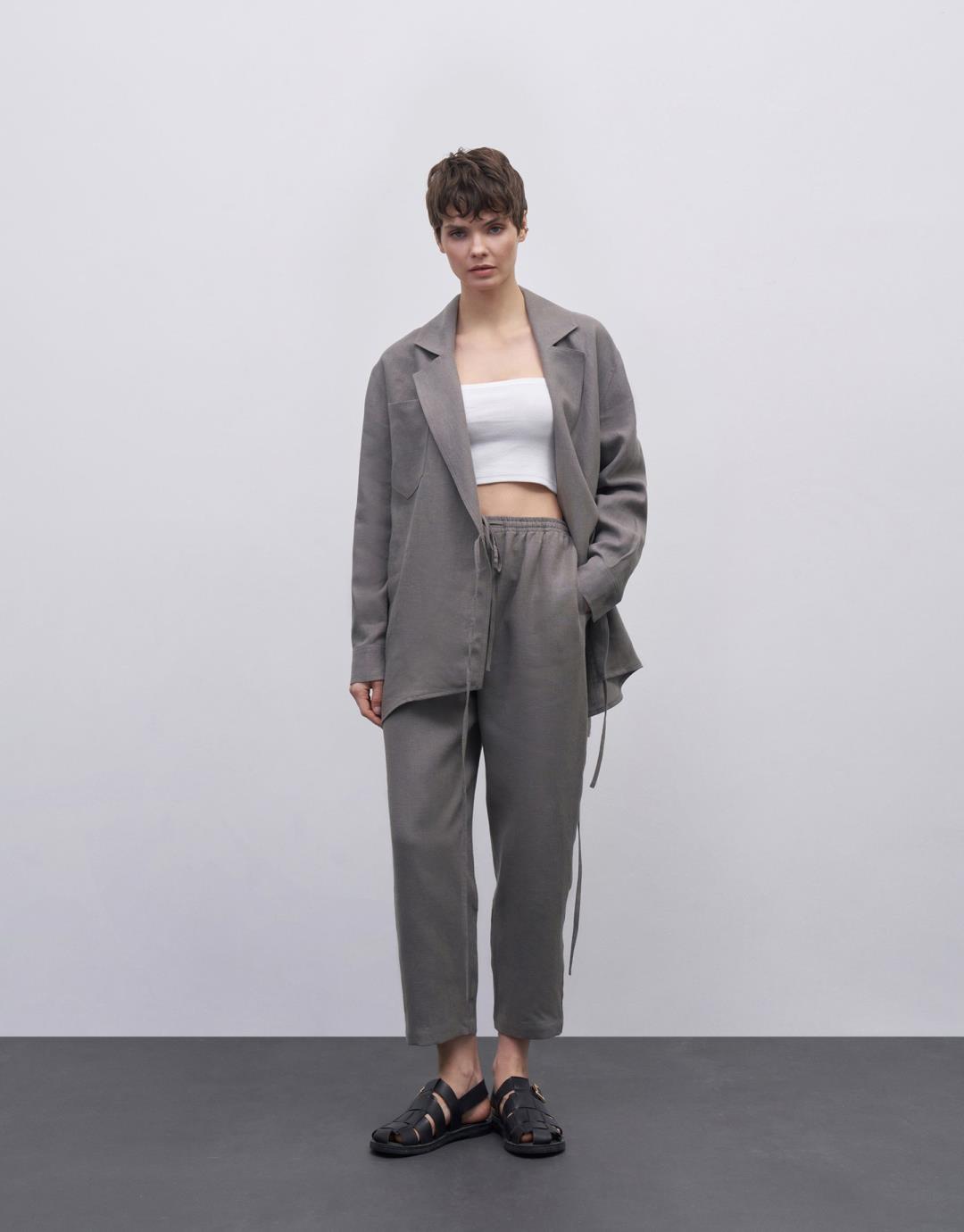 Fabric Content: 100% LINEN Product Details: Top: Double-breasted front closure. Rope detail on side seams. Buttoned cuff. Drop shoulders. Asymmetrical cut hem. Bottom: Elastic. Pockets in side seams. Loose fit. Carrot fit. Model Size: 36 Model Height: 1.72 The product on the model is size 36. Usage and Washing Instructions: Tetrachlorethylene Dry Cleaning. Roller cleaning is not done. Tumble drying is not done. Bleach bleach is not used.