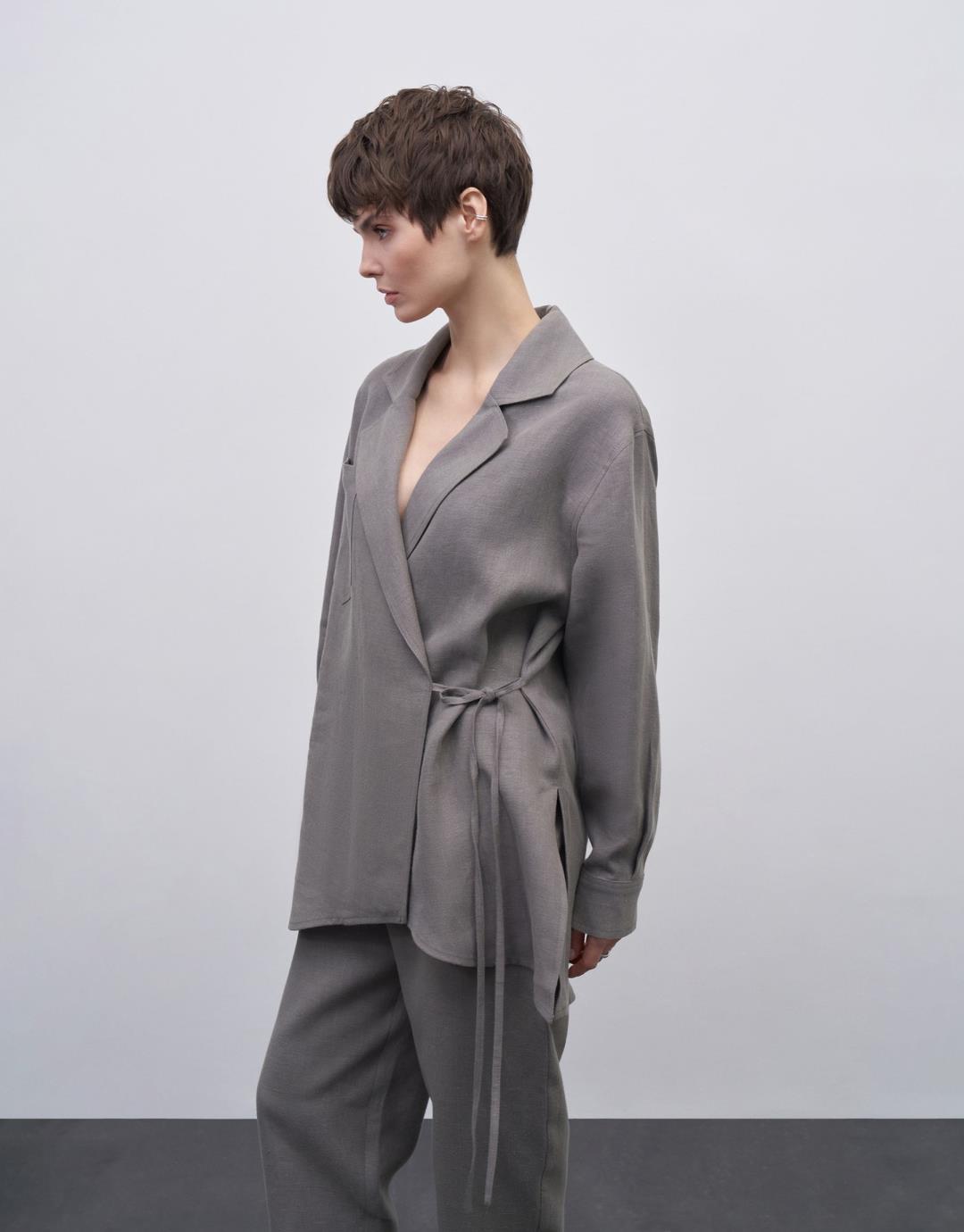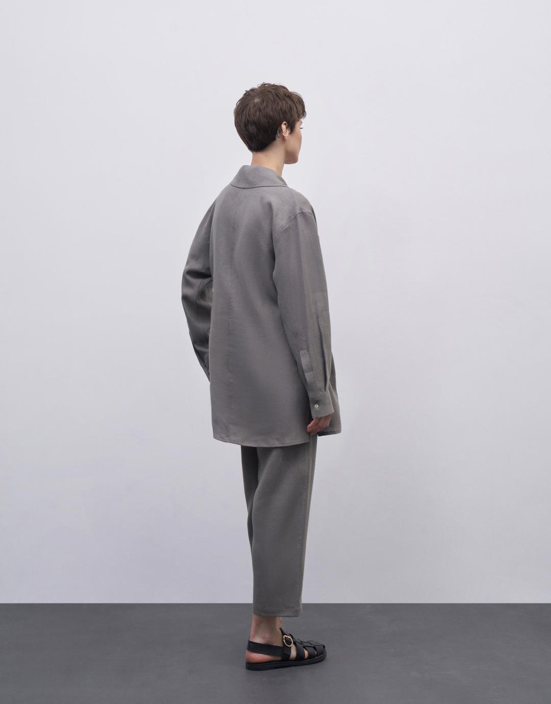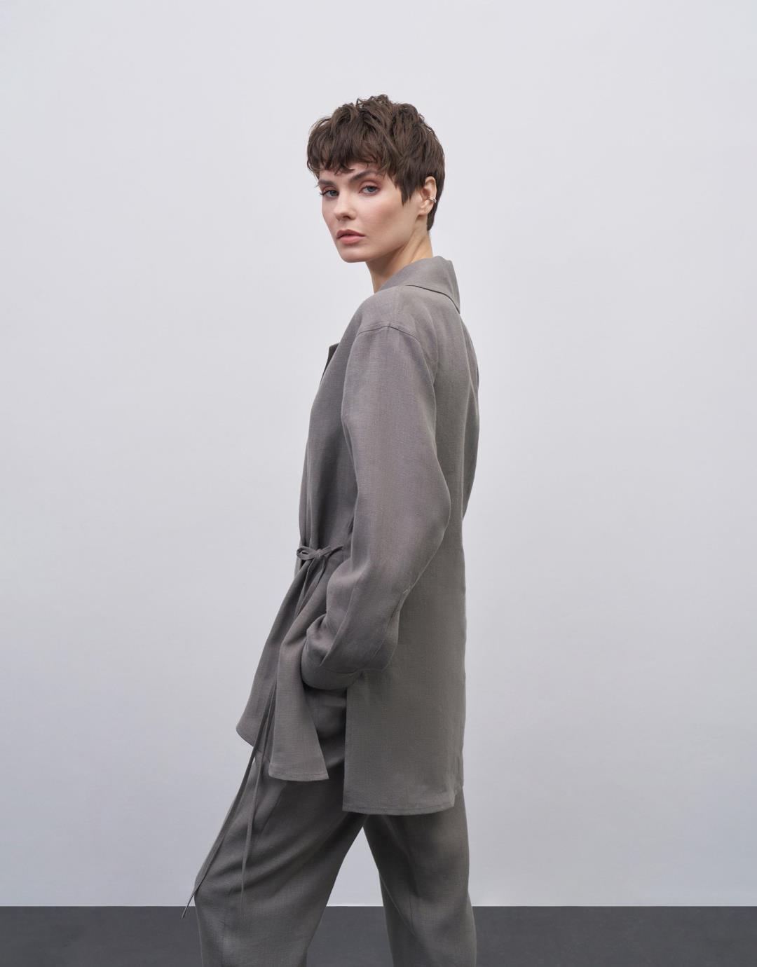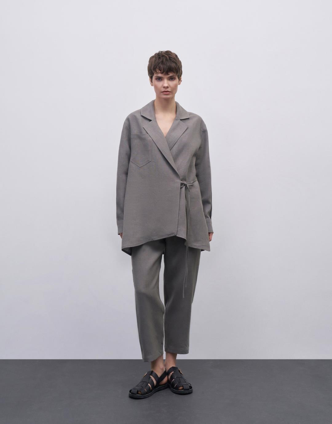 Fabric Content: 100% LINEN Product Details: Top: Double-breasted front closure. Rope detail on side seams. Buttoned cuff. Drop shoulders. Asymmetrical cut hem. Bottom: Elastic. Pockets in side seams. Loose fit. Carrot fit. Model Size: 36 Model Height: 1.72 The product on the model is size 36. Usage and Washing Instructions: Tetrachlorethylene Dry Cleaning. Roller cleaning is not done. Tumble drying is not done. Bleach bleach is not used.