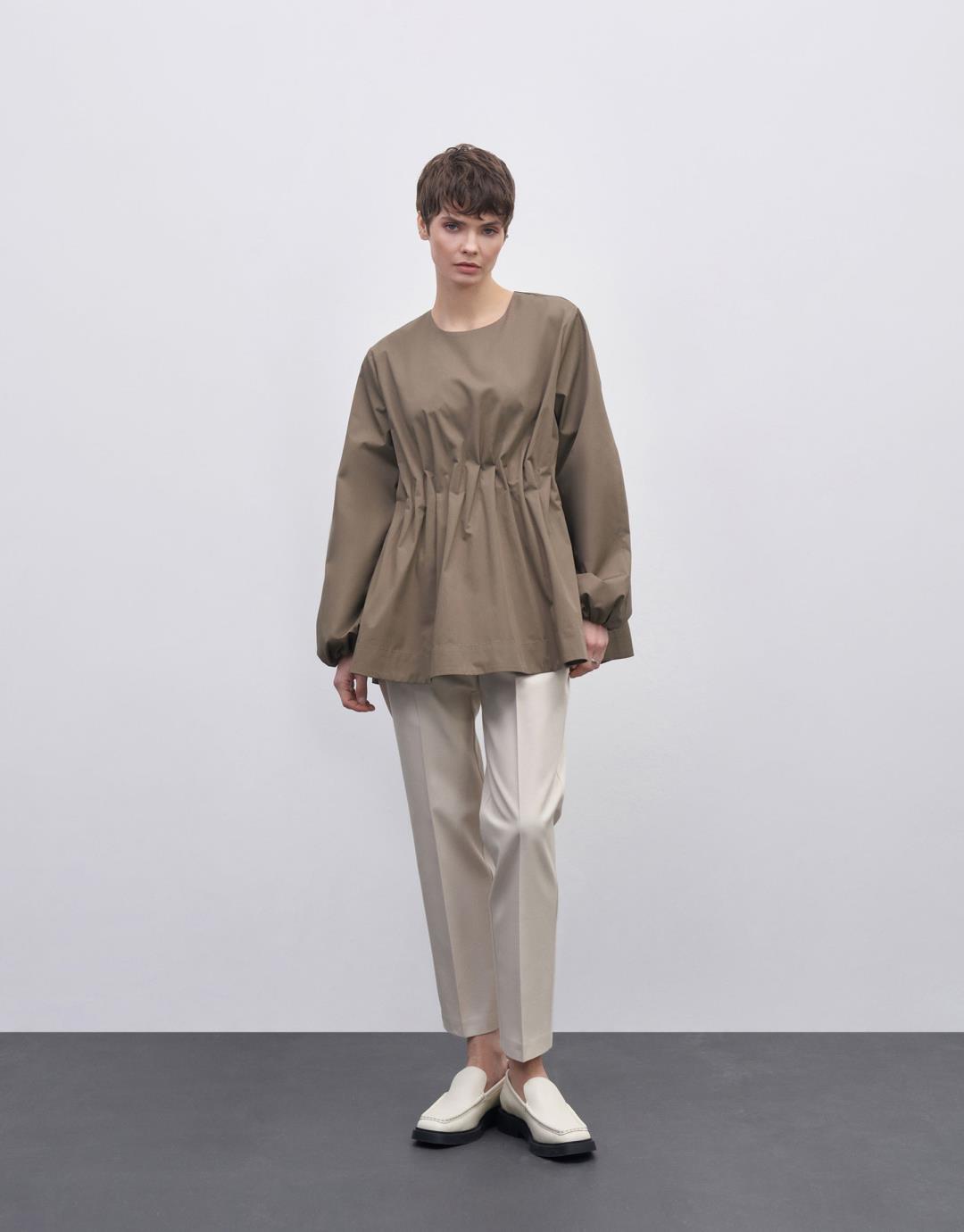 Fabric Content: 100% COTTON Product Details: Zipper closure at the back. Balloon arm. Gathering detail at waist. Model Size: 36 Model Height: 1.78 The product on the model is size 36. Usage and Washing Instructions: Tetrachlorethylene Dry Cleaning. Roller cleaning is not done. Tumble drying is not done. Bleach bleach is not used.