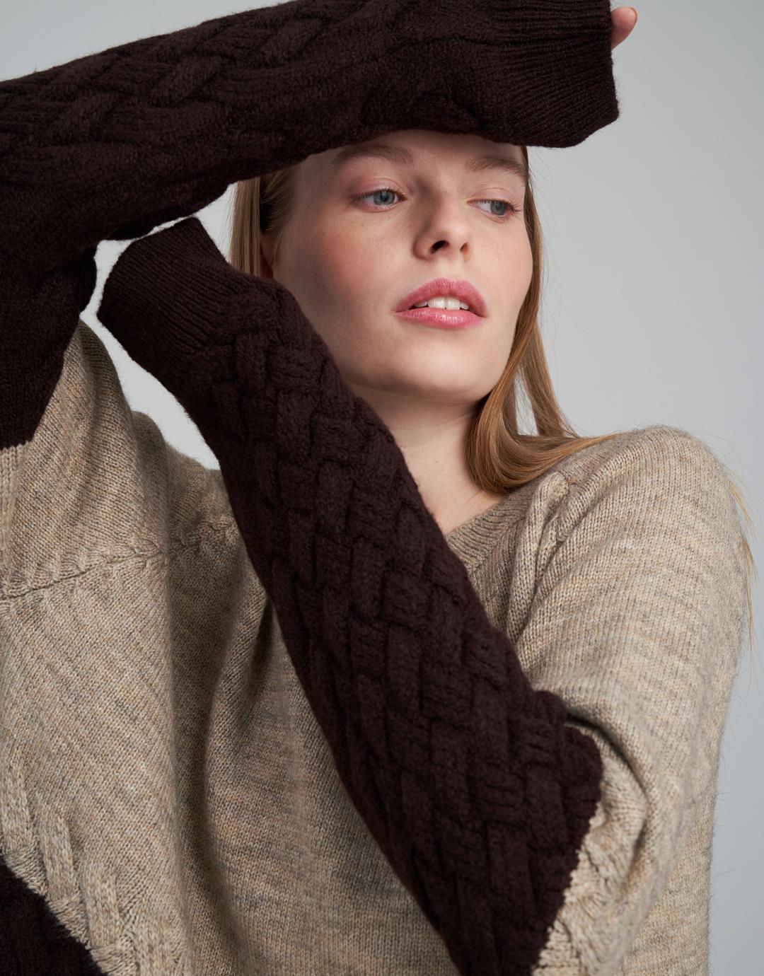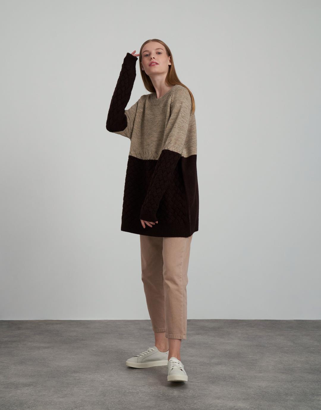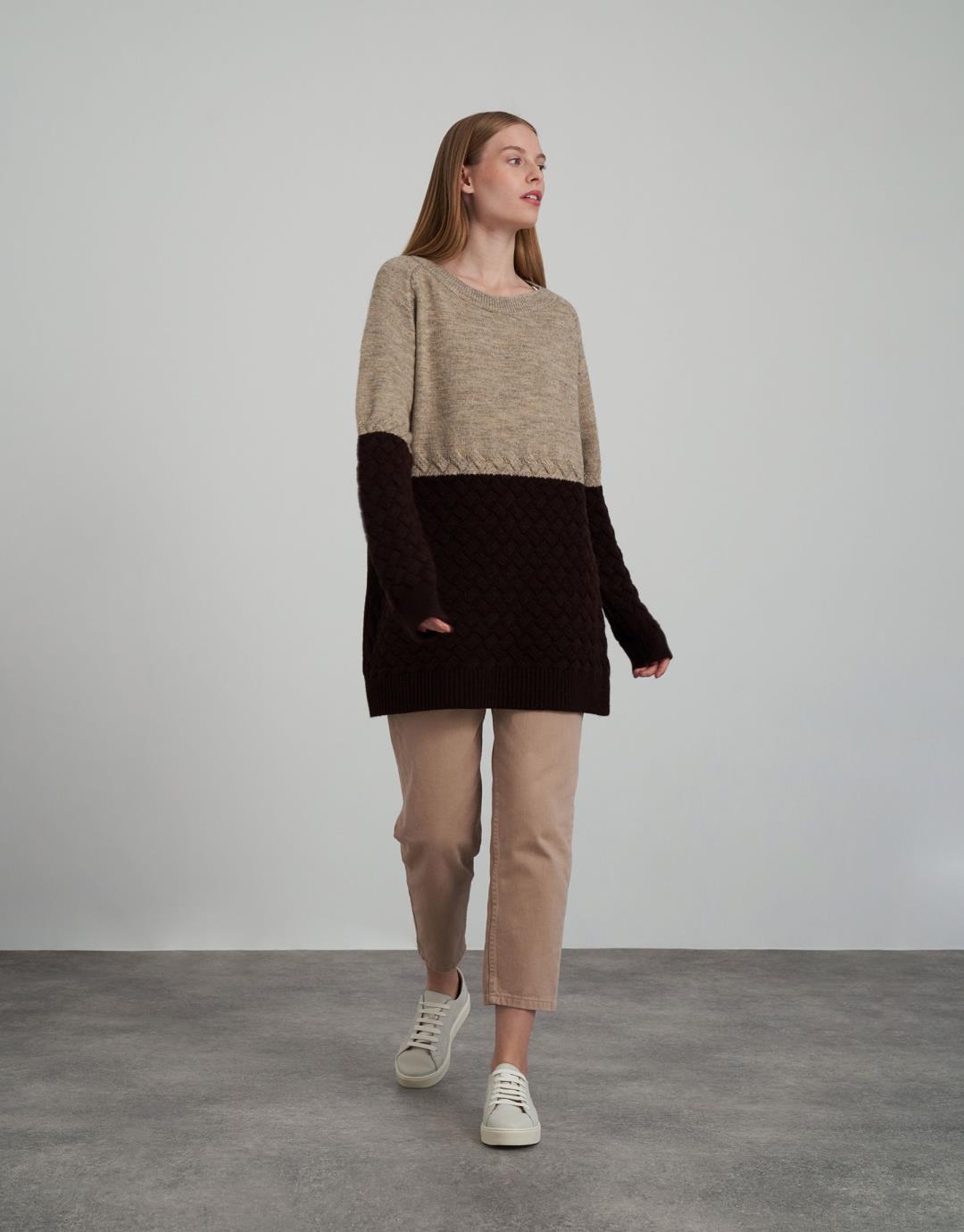 Fabric Content: 100% Soft Acrlyc Fabric Info: Knitted Sleeve Detail Long sleeve Product Details: Crew neck, double colour, basket weave Mould Information: Loose Model Size : 36 Model Height : 1.78 The product on the Model is standard size. Usage and Washing Instructions : Recommended Dry cleaning.