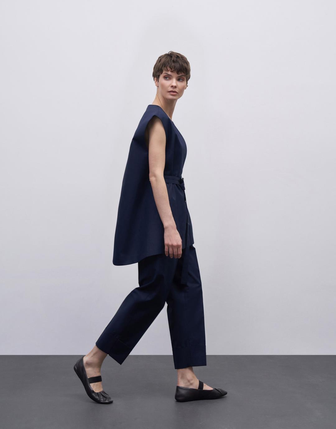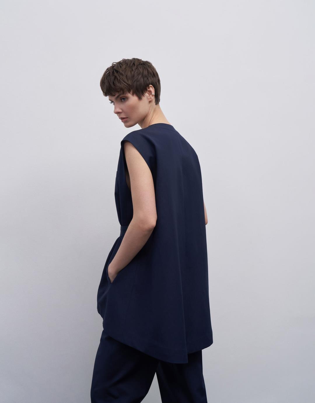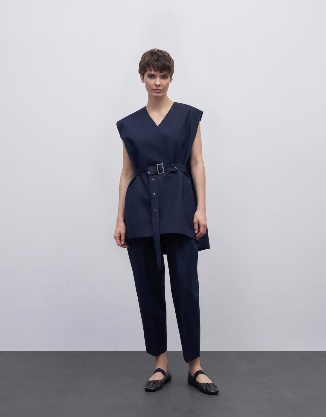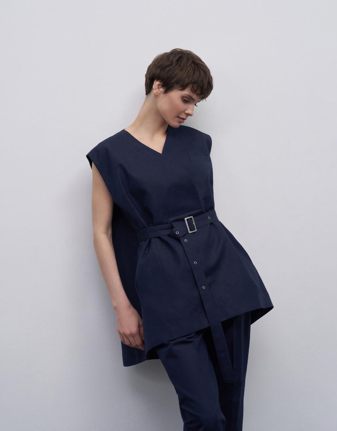 Fabric Content: 52% 0.COT 48% LIN Product Details: V-neck. Drop shoulder detail. Sleeveless. Belt with metal buckle. Welt pocket at chest level. Loose fit. Model Size: 36 Model Height: 1.72 The product on the Mannequin is STANDARD Size. Usage and Washing Instructions: Tetrachlorethylene Dry Cleaning. Roller cleaning is not done. Tumble drying is not done. Bleach bleach is not used.