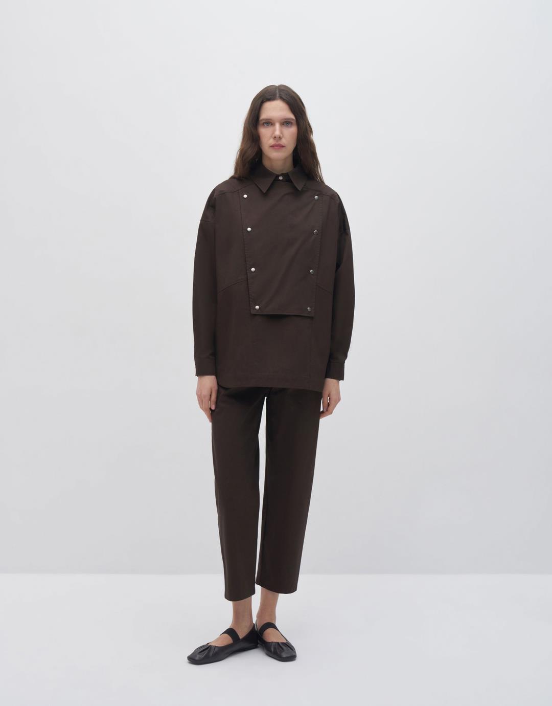Fabric Content: 100% COTTON Product Details: Front half placket and snap closure. The cuffs should snap closed. Model Size: 36 Model Height: 1.78 The product on the model is size 36. Usage and Washing Instructions: Hand wash at maximum 30ºC. Bleach bleach is not used. Roller Cleaning is Not Made. Wash inside out. Tetrachlorethylene Dry Cleaning. Dryer is not used. It is a sensitive product. Do not use with metal accessories.