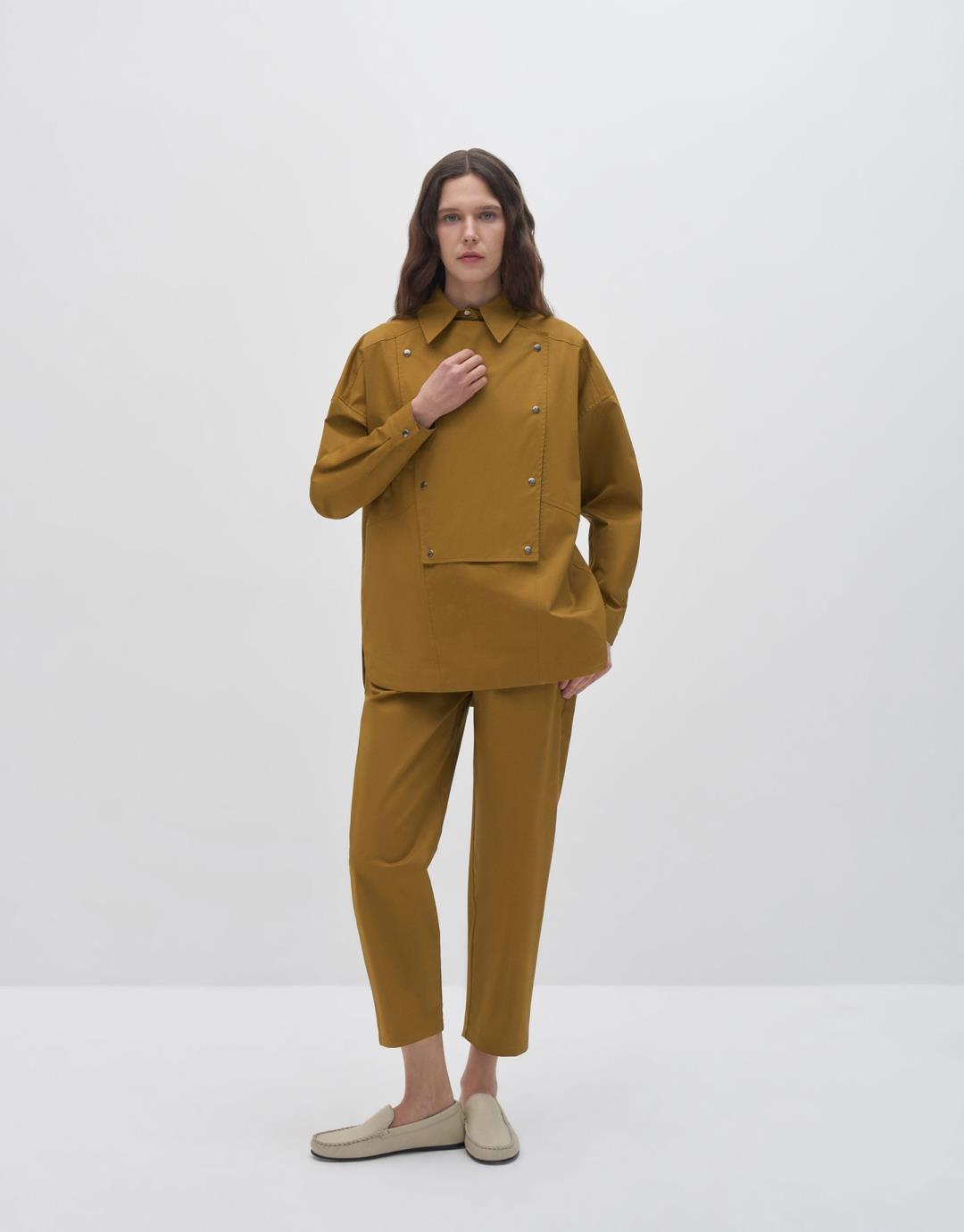 Fabric Content: 100% COTTON Product Details: Front half placket and snap closure. The cuffs should snap closed. Model Size: 36 Model Height: 1.78 The product on the model is size 36. Usage and Washing Instructions: Hand wash at maximum 30ºC. Bleach bleach is not used. Roller Cleaning is Not Made. Wash inside out. Tetrachlorethylene Dry Cleaning. Dryer is not used. It is a sensitive product. Do not use with metal accessories.