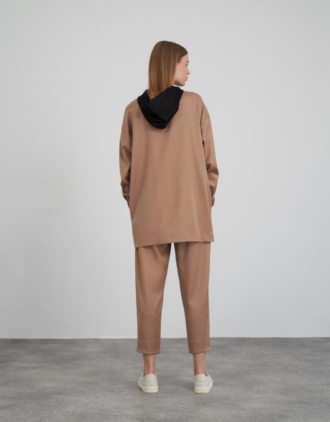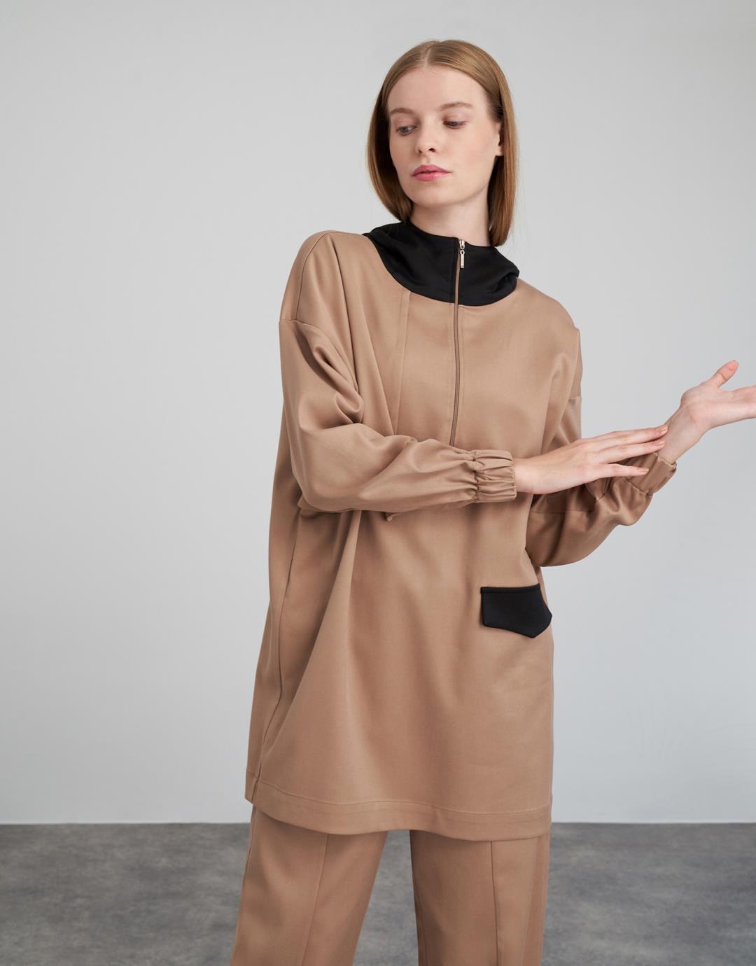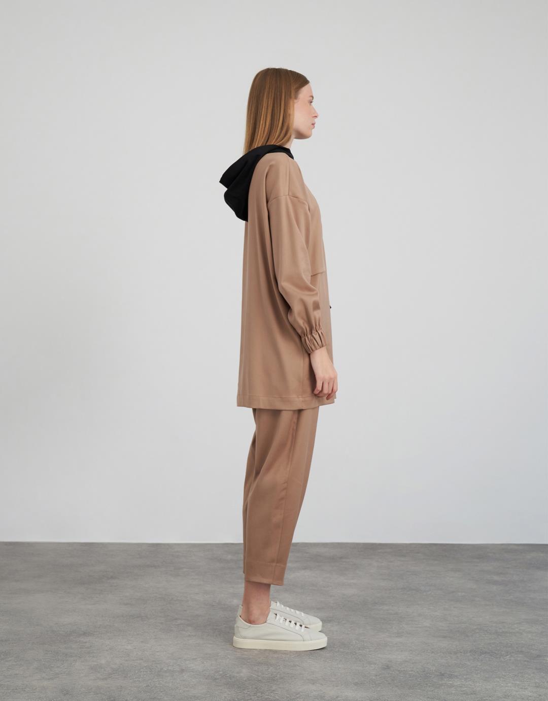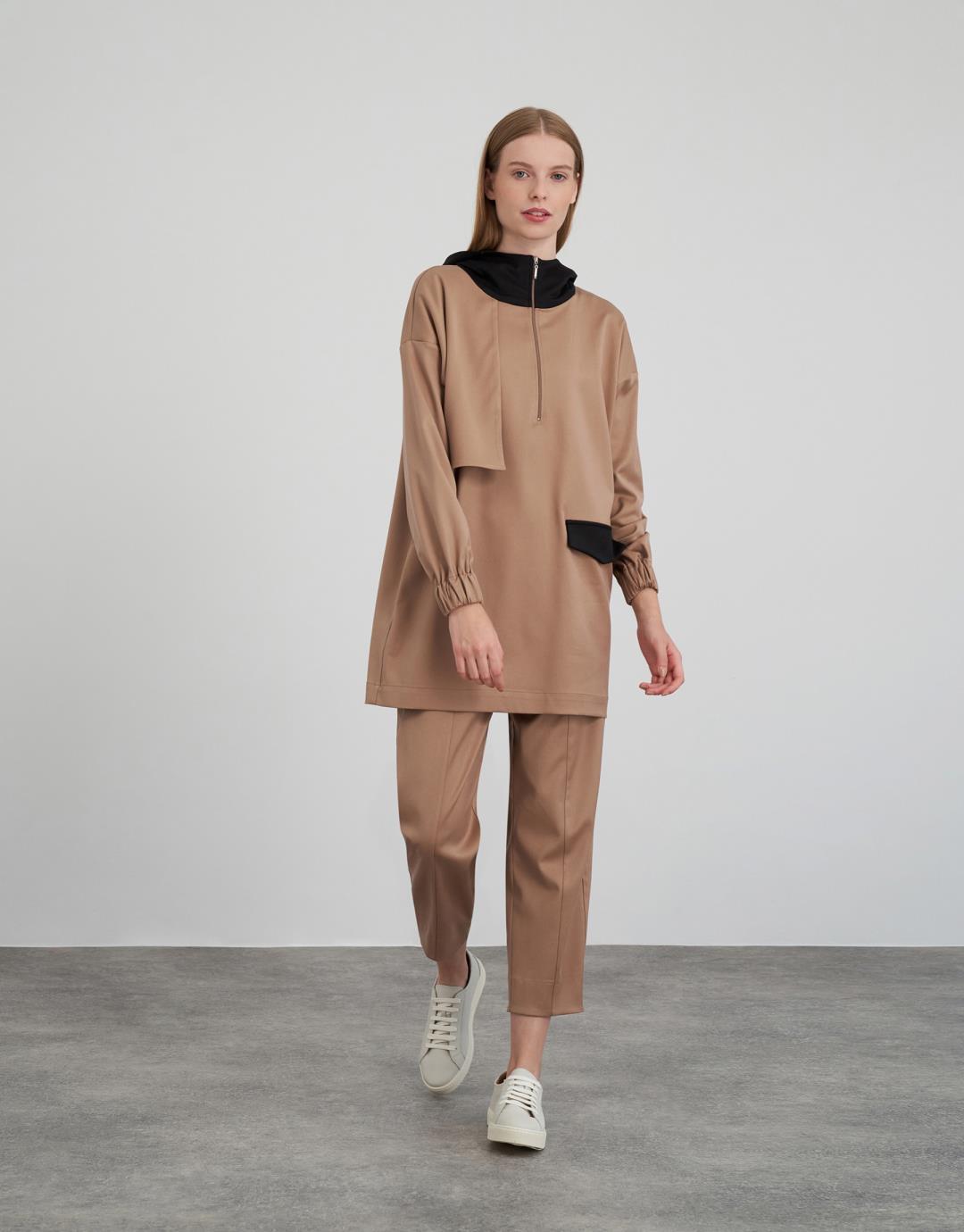 Fabric Content: 70% cotton 30% pes Fabric Information: Woven Pocket Info : 1 ornamental pocket Zip Info: The top piece has a half zip at the front, the trousers have a side zip with an inner elasticated waistband. Sleeve Detail: Elasticated sleeve ends Product Details: Garnished, hooded Mould Information: Loose Model Size : 36 Model Height : 1.78 The product on the Model is size 1. Usage and Washing Instructions : Recommended Dry cleaning.