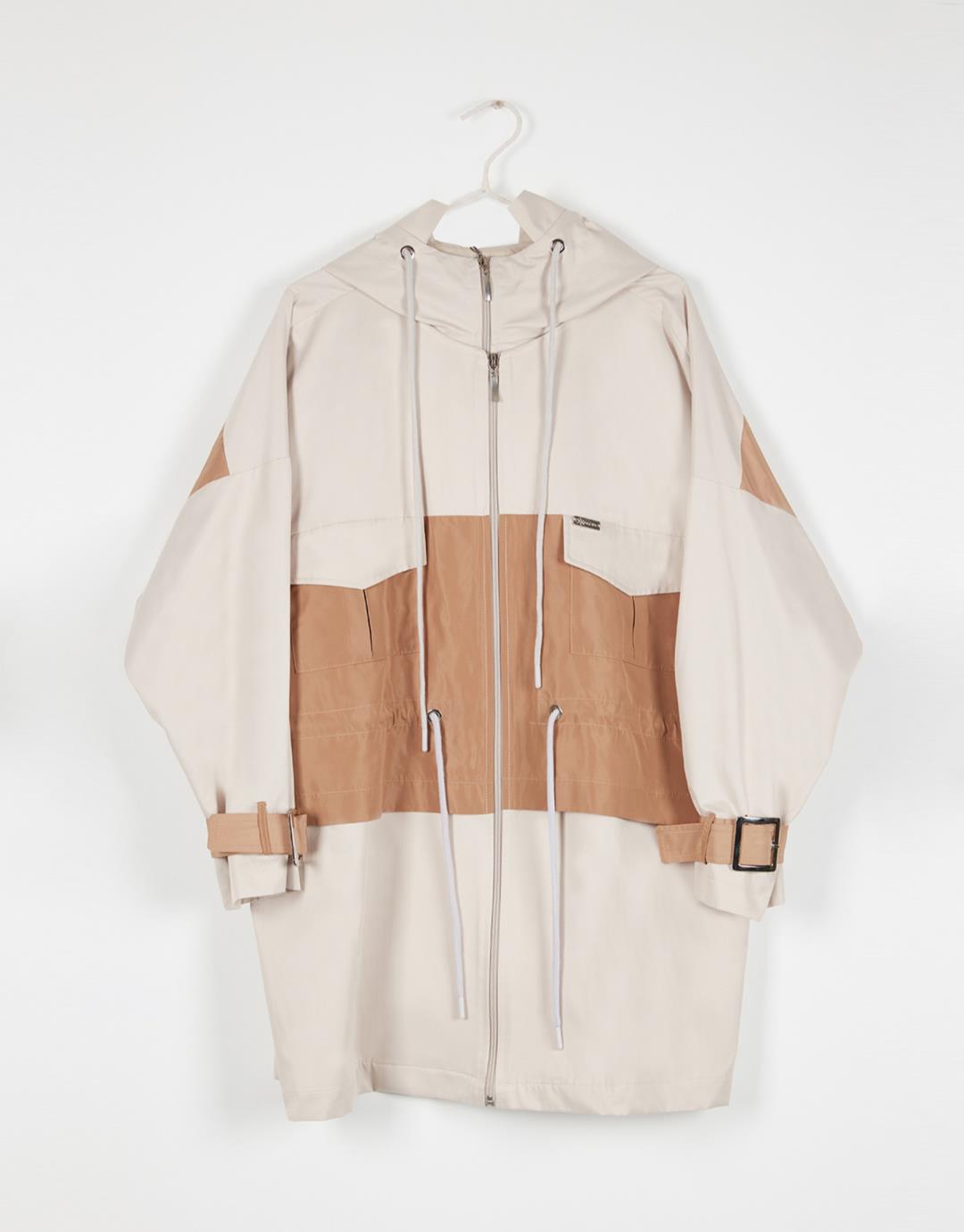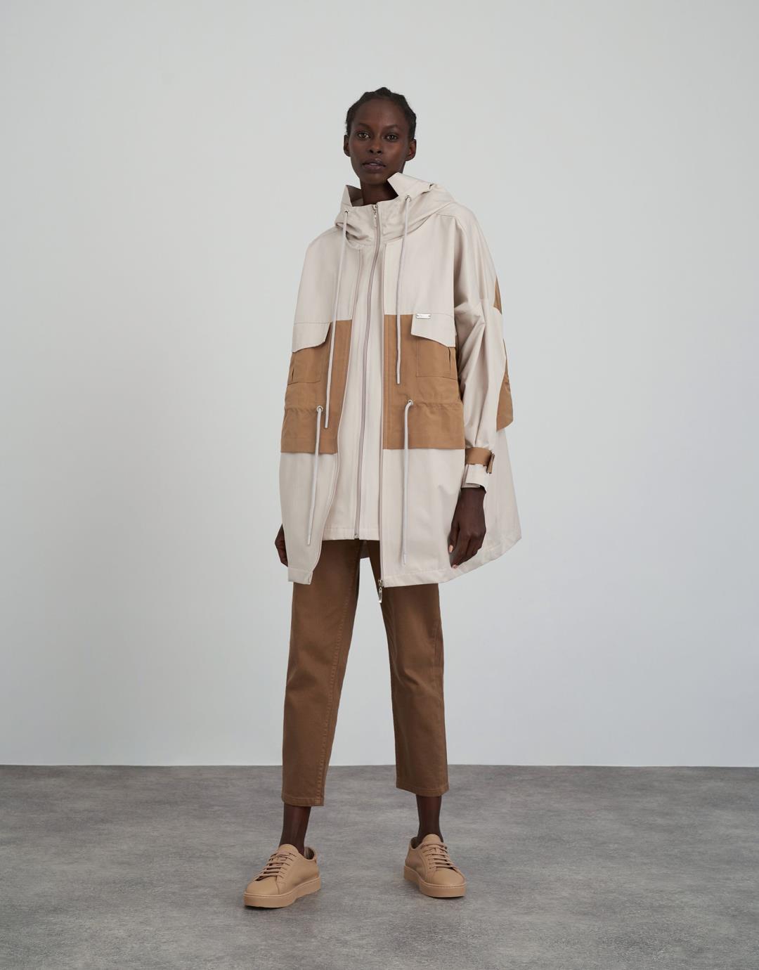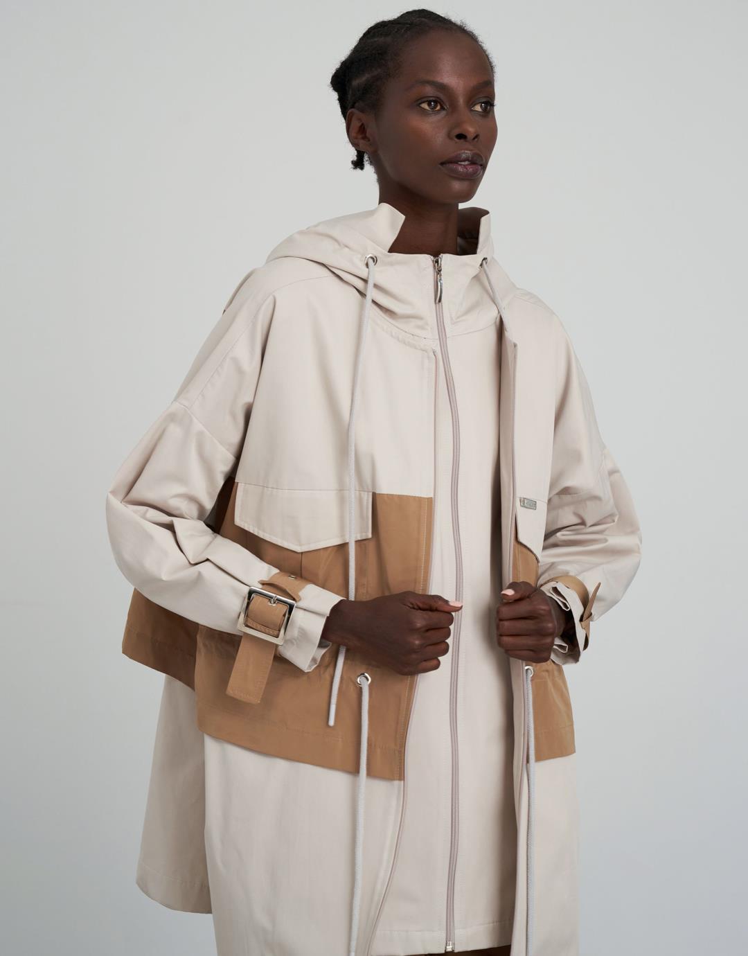 Fabric Content: 55%cotton 45%polyester Fabric Information: Woven Pocket Info : 2 Pockets Lining Information: 100% cotton Zipper Info: Front Double zip Arm Detail Arched Product Details: has a hood and drawcord at the waist. Mould Information: loose Model Size : 36 Model Height : 1.78 The product on the Model is std size. Usage and Washing Instructions: Recommended Dry cleaning.