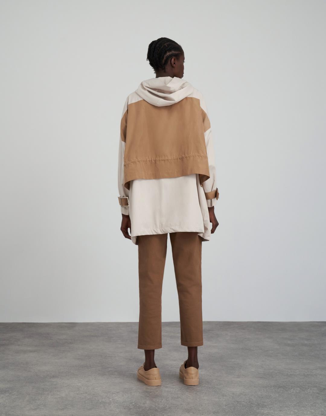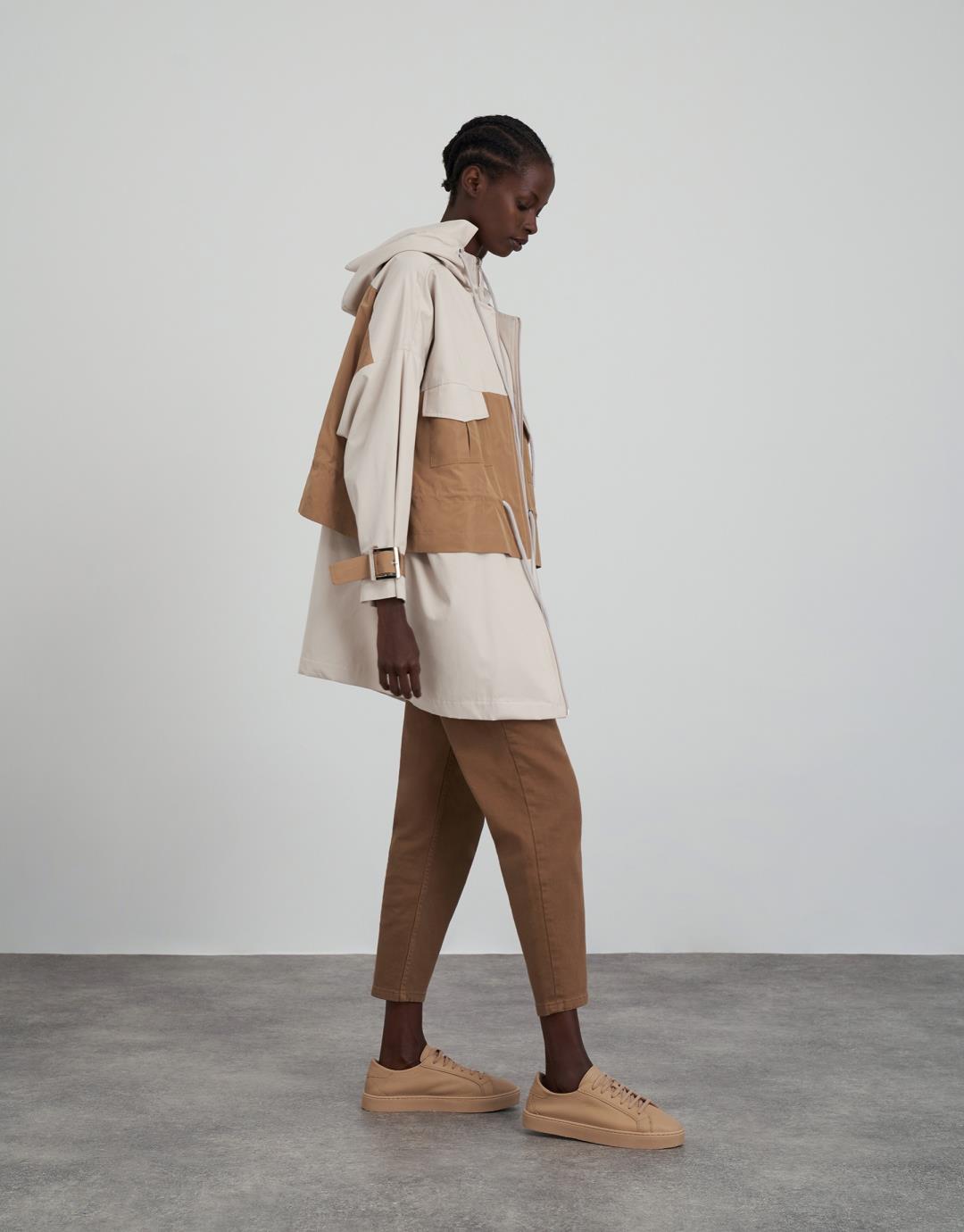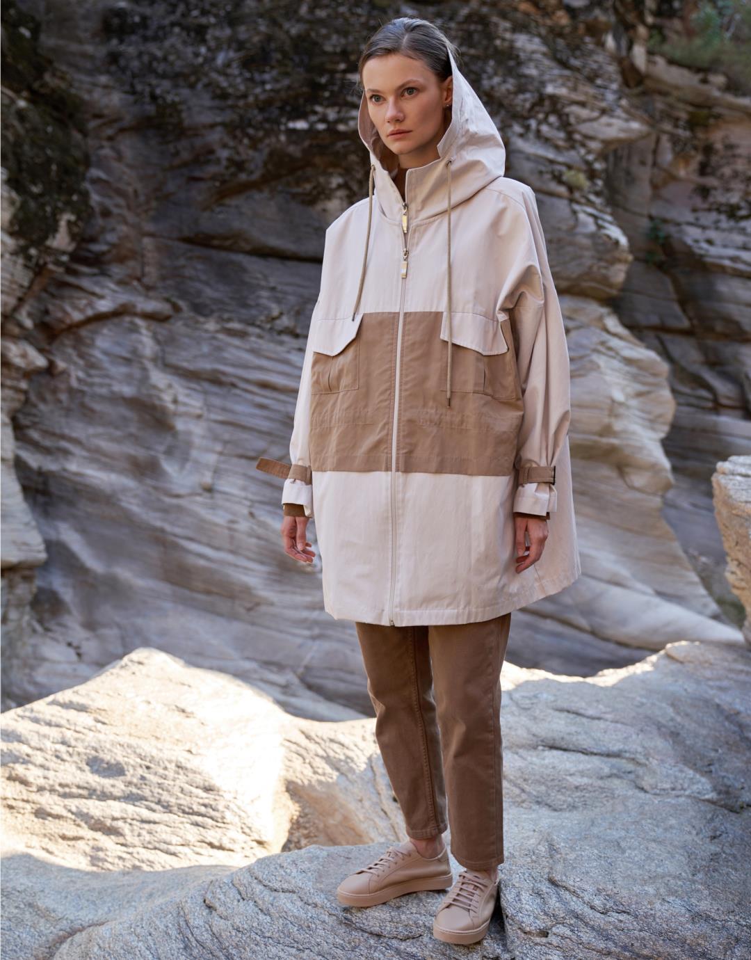 Fabric Content: 55%cotton 45%polyester Fabric Information: Woven Pocket Info : 2 Pockets Lining Information: 100% cotton Zipper Info: Front Double zip Arm Detail Arched Product Details: has a hood and drawcord at the waist. Mould Information: loose Model Size : 36 Model Height : 1.78 The product on the Model is std size. Usage and Washing Instructions: Recommended Dry cleaning.
