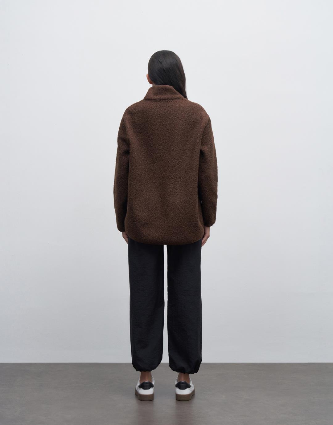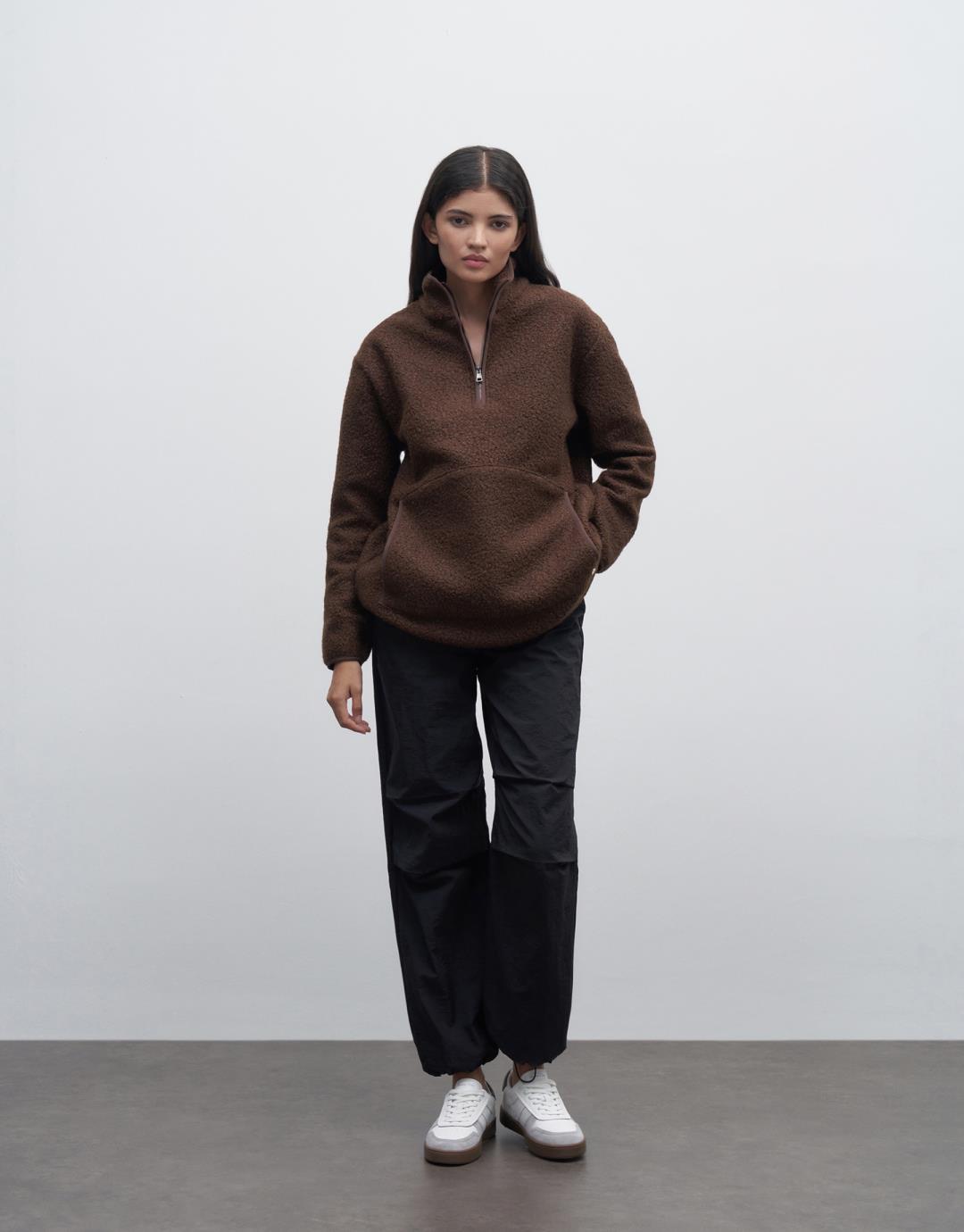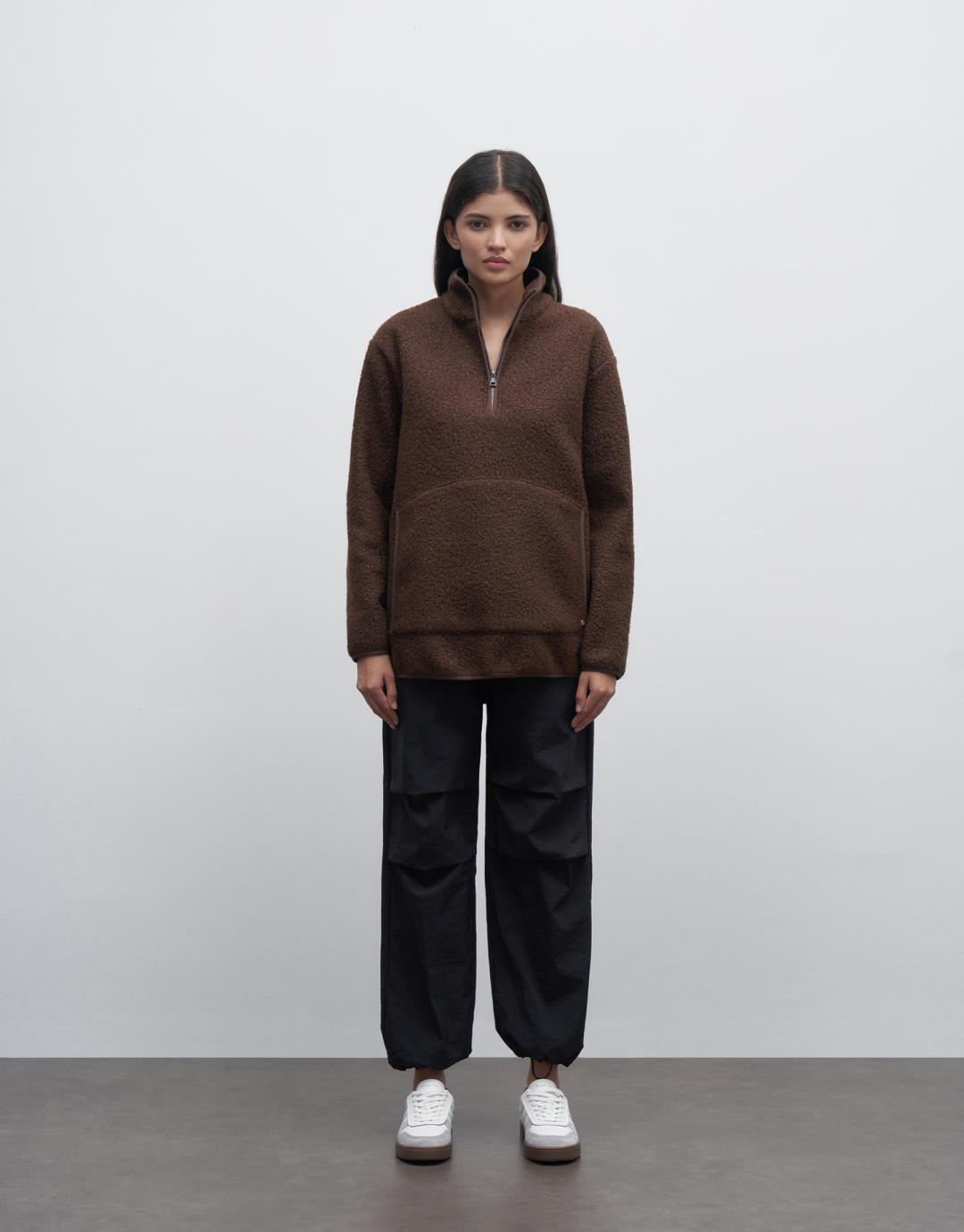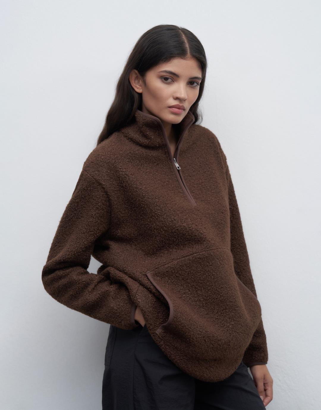 Fabric Content:  100% PES Product Details: Front half placket and zipper closure. Kangaroo pocket. Model Size: 36 Model Height: 1.78 The product on the model is size 36. Usage and Washing Instructions: Tetrachlorethylene Dry Cleaning. It is not washed. Roller cleaning is not possible. Tumble drying is not done. Bleach is not used.