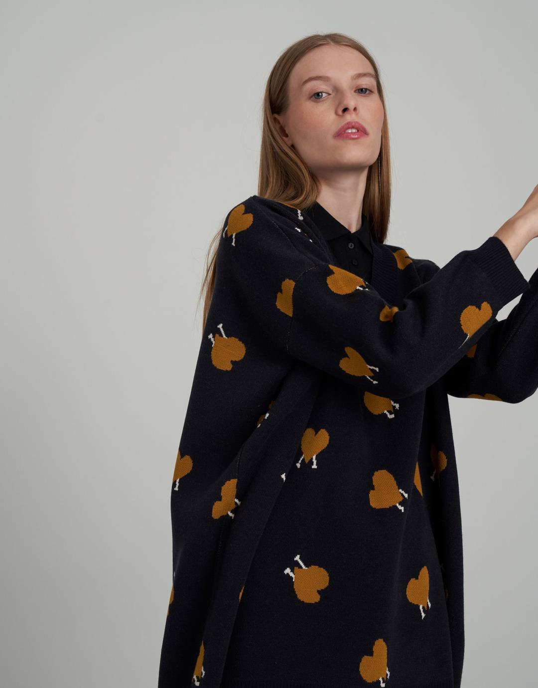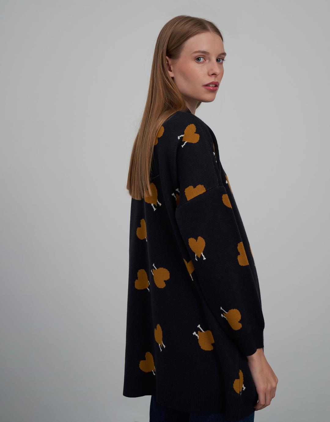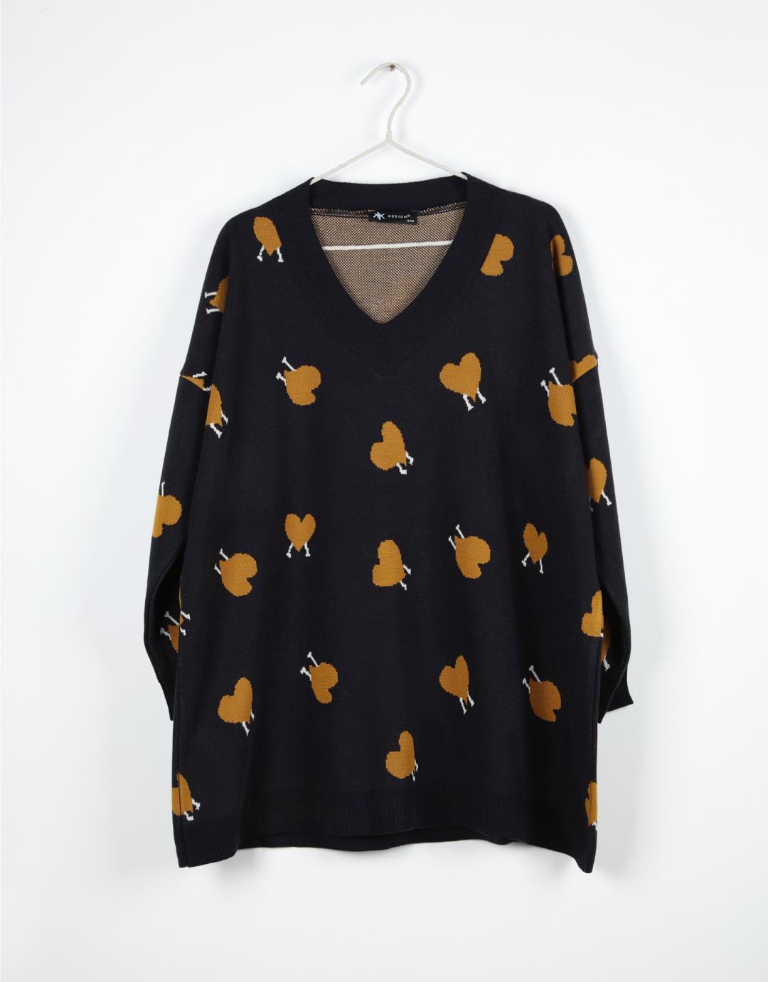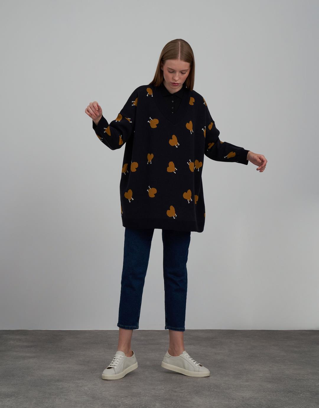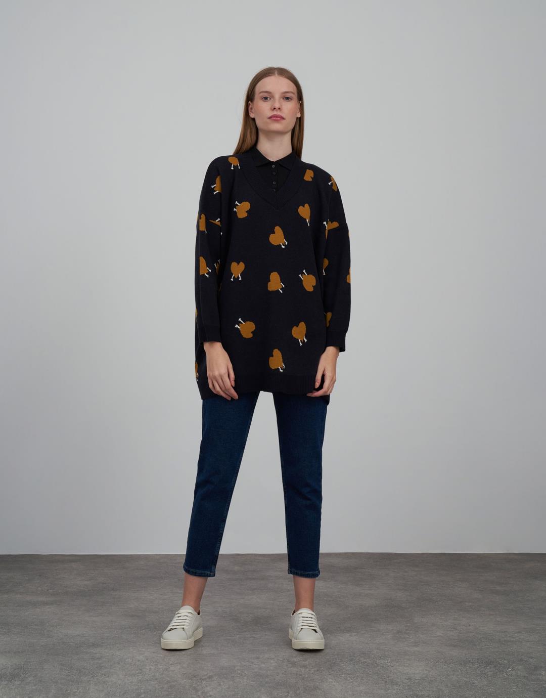 Heart Patterned V-Neck Oversize Sweater – Navy Blue – 14099