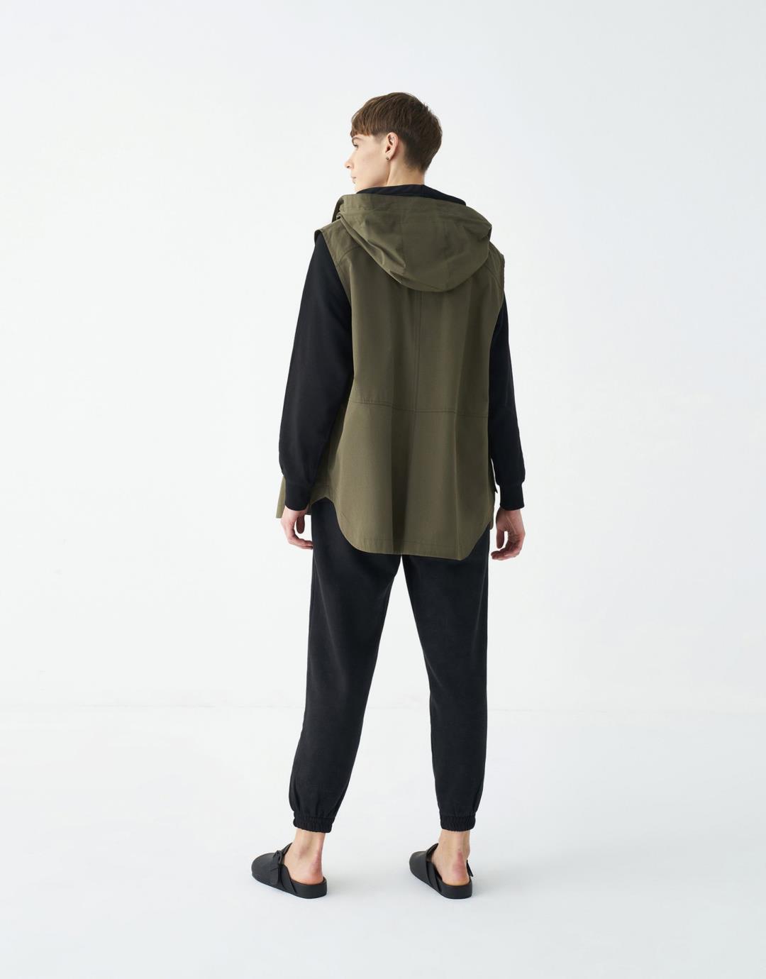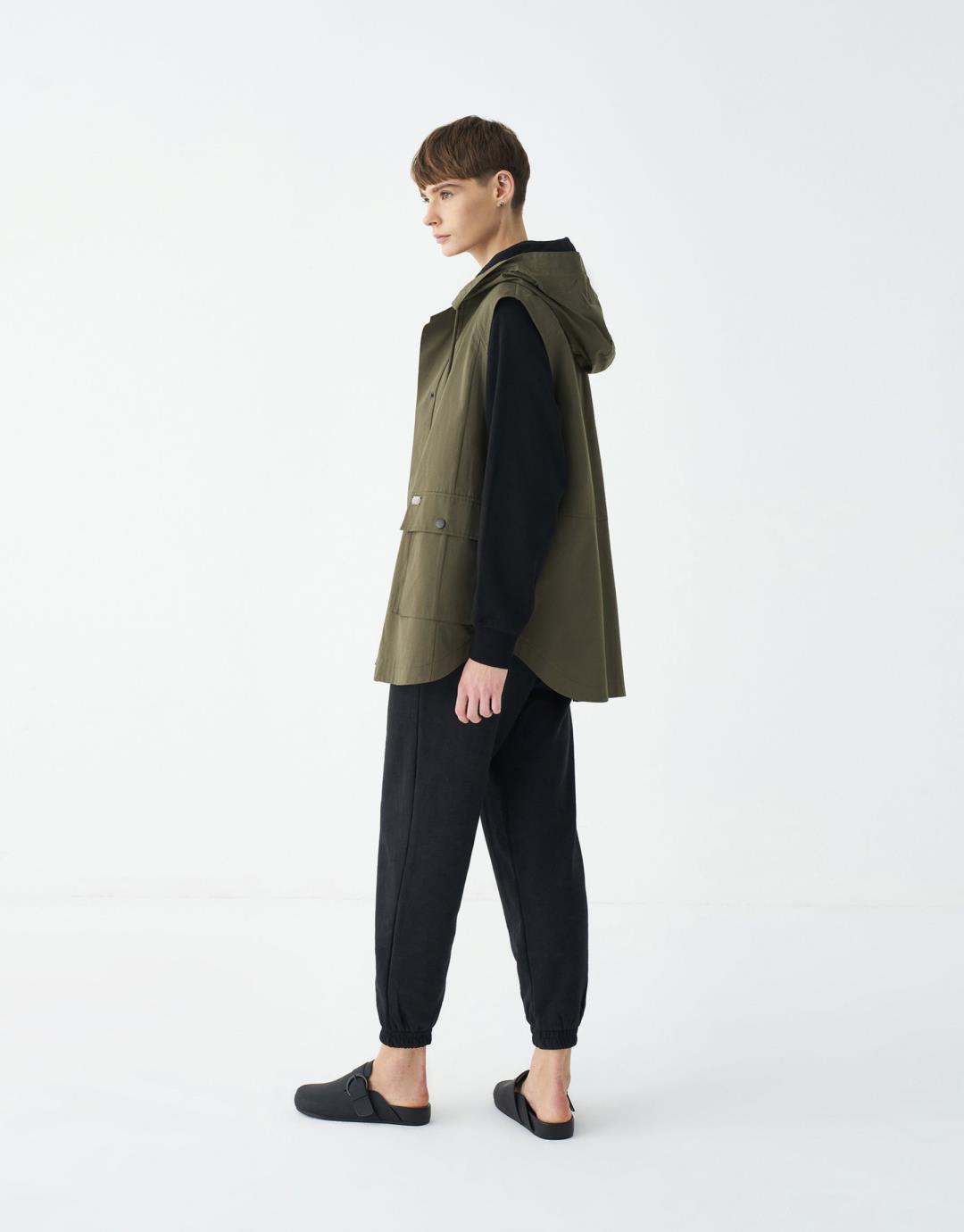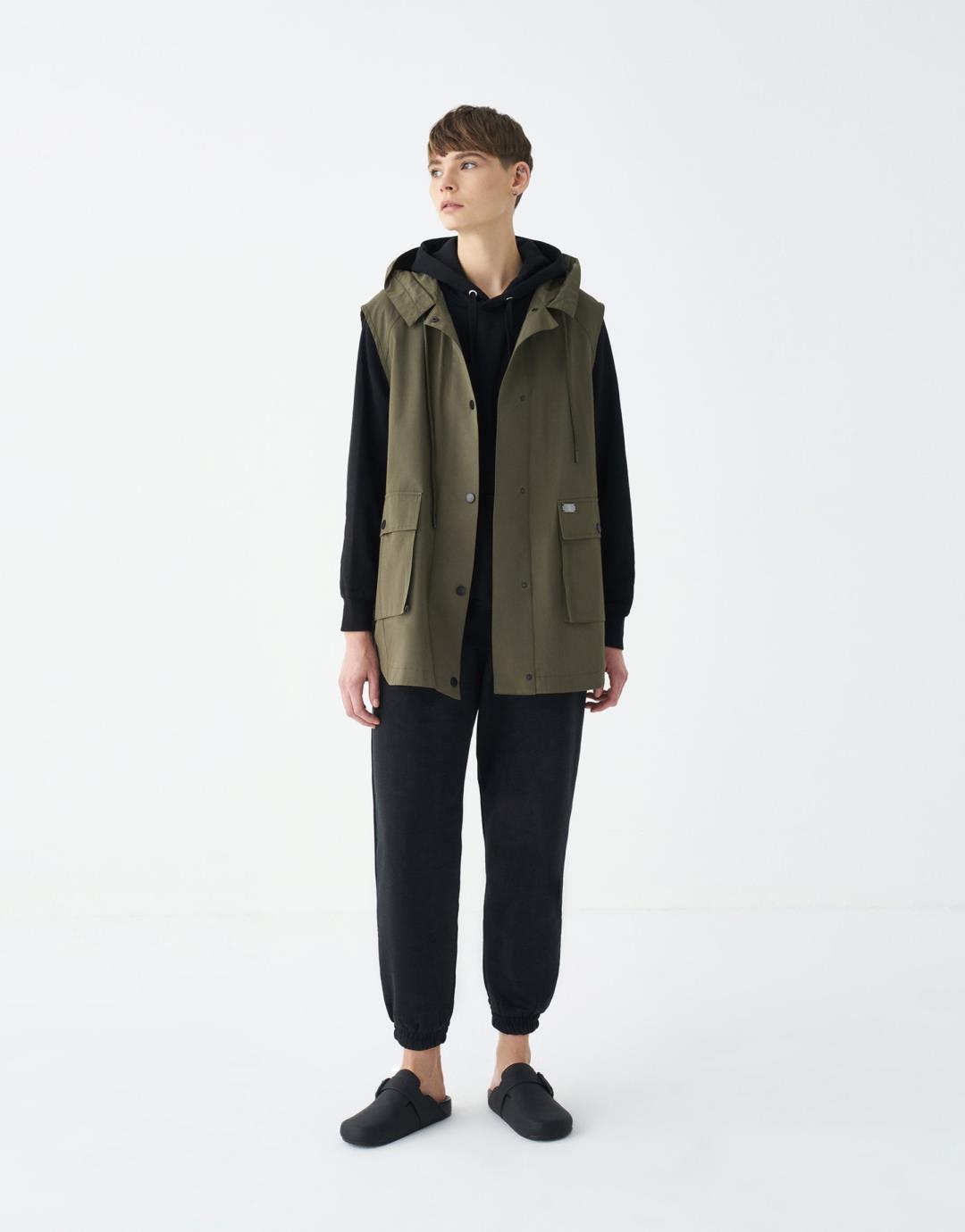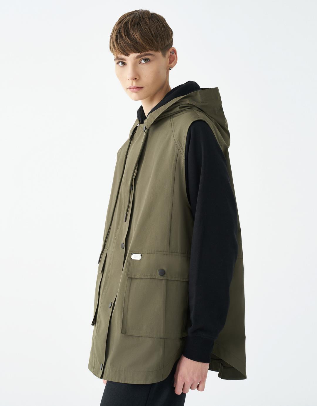 Fabric Content: 50%COTTON 50%PES Product Details : Wide cut. Front snaps. Hooded. Two large front flap pockets with snap fasteners. Sleeveless. Model Size : 36 Model Height: 1.78 The product on the mannequin is size S/M. Usage and Washing Instructions: Do the recommended dry cleaning.