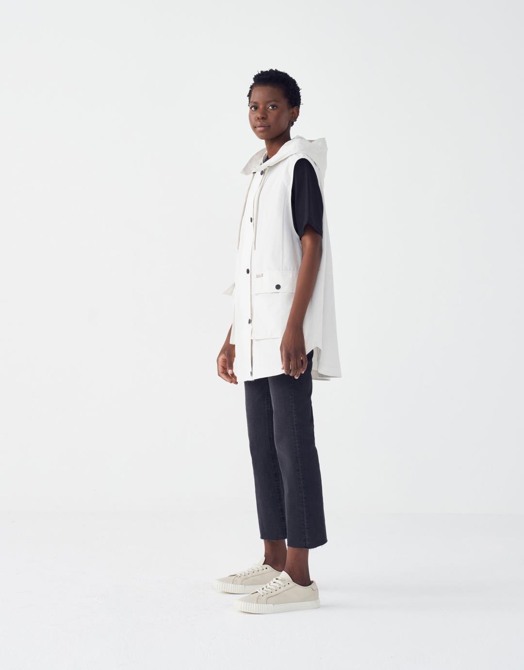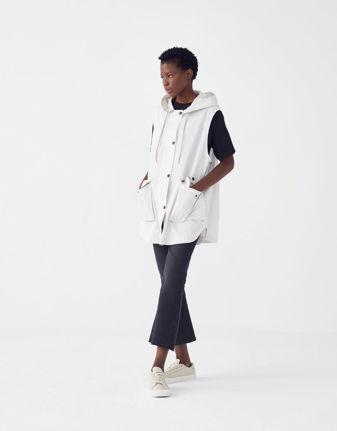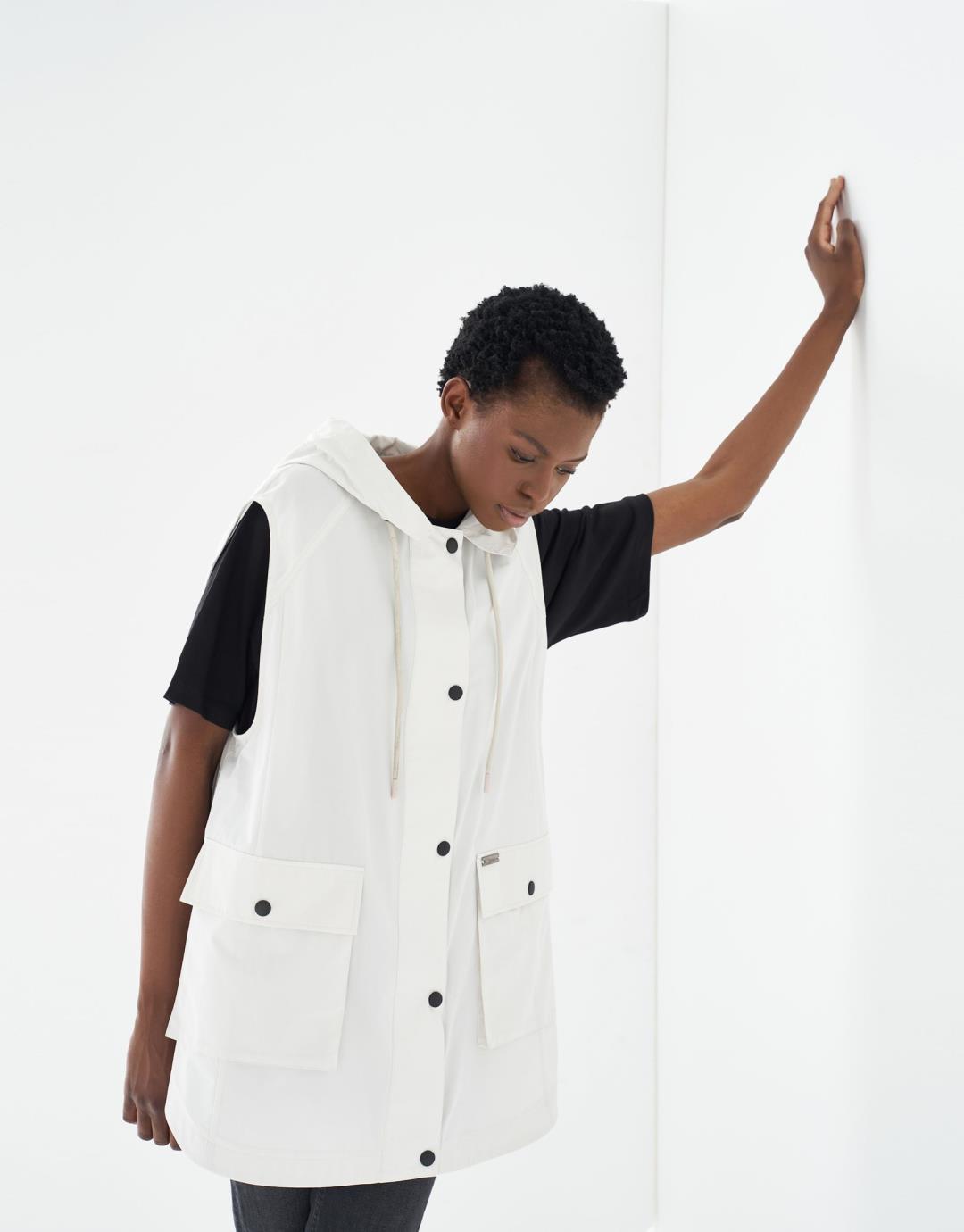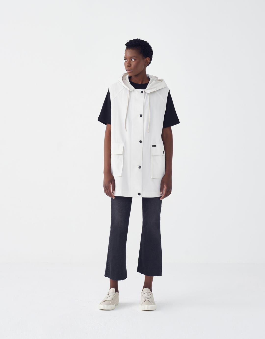 Fabric Content: 50%COTTON 50%PES Product Details : Wide cut. Front snaps. Hooded. Two large front flap pockets with snap fasteners. Sleeveless. Model Size : 36 Model Height: 1.78 The product on the mannequin is size S/M. Usage and Washing Instructions: Do the recommended dry cleaning.