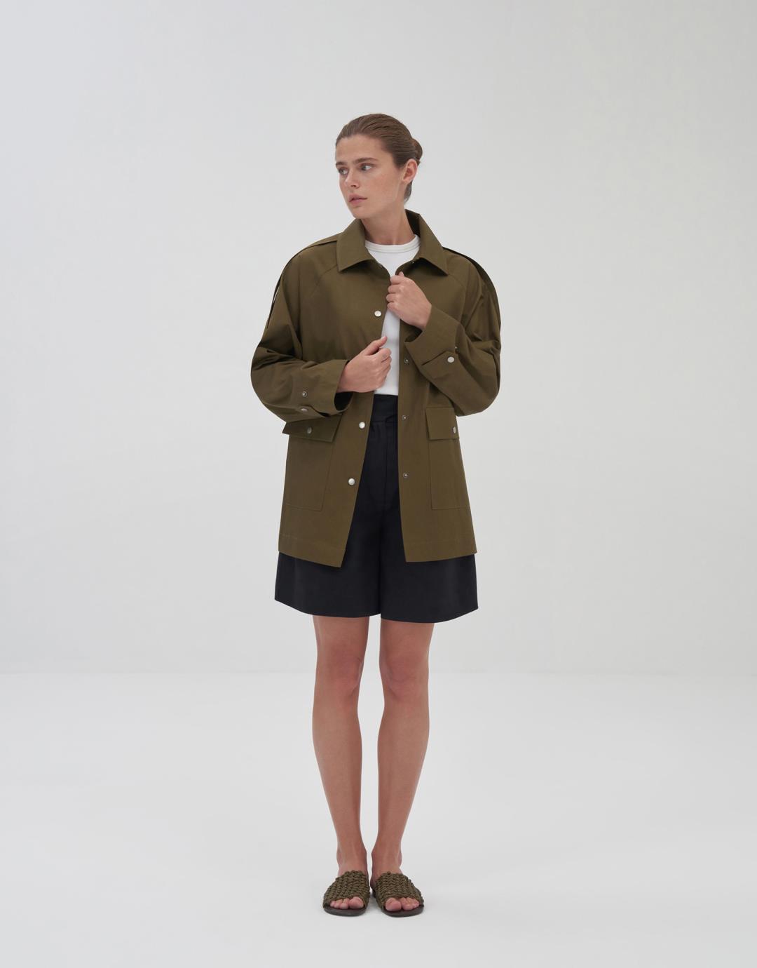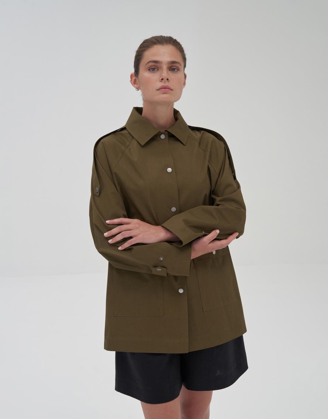 Fabric Content: 100% COTTON Product Details: Front snap closure. Raglan sleeve. Two flap pockets on the front body.Epaulette detail on shoulders. Model Size: 36 Model Height: 1.72 The product on the model is size 38. Usage and Washing Instructions: Tetrachlorethylene Dry Cleaning. Roller cleaning is not done. Tumble drying is not done. Bleach bleach is not used.