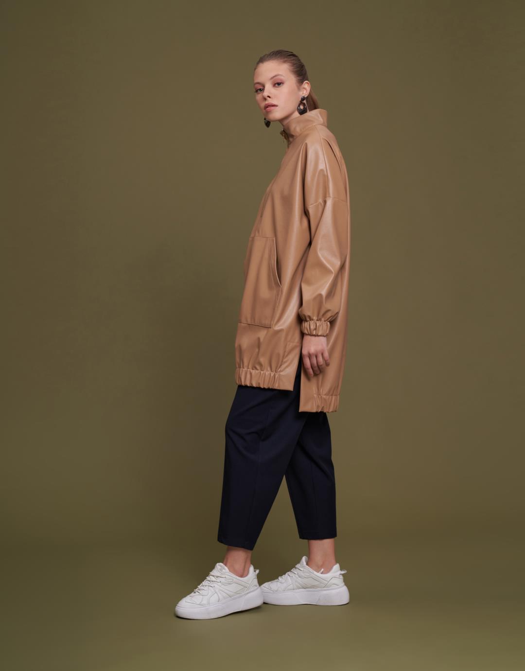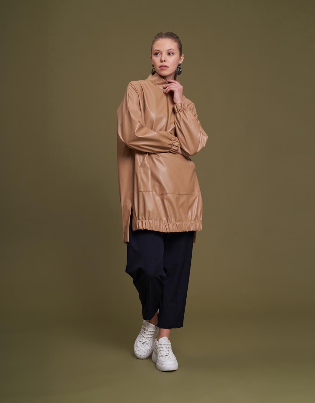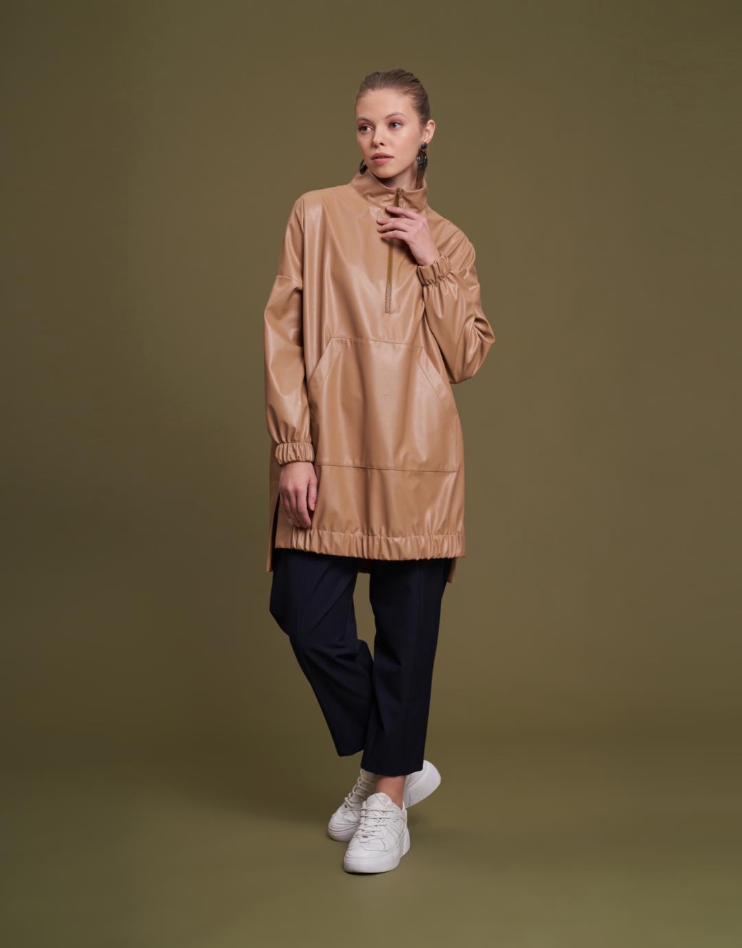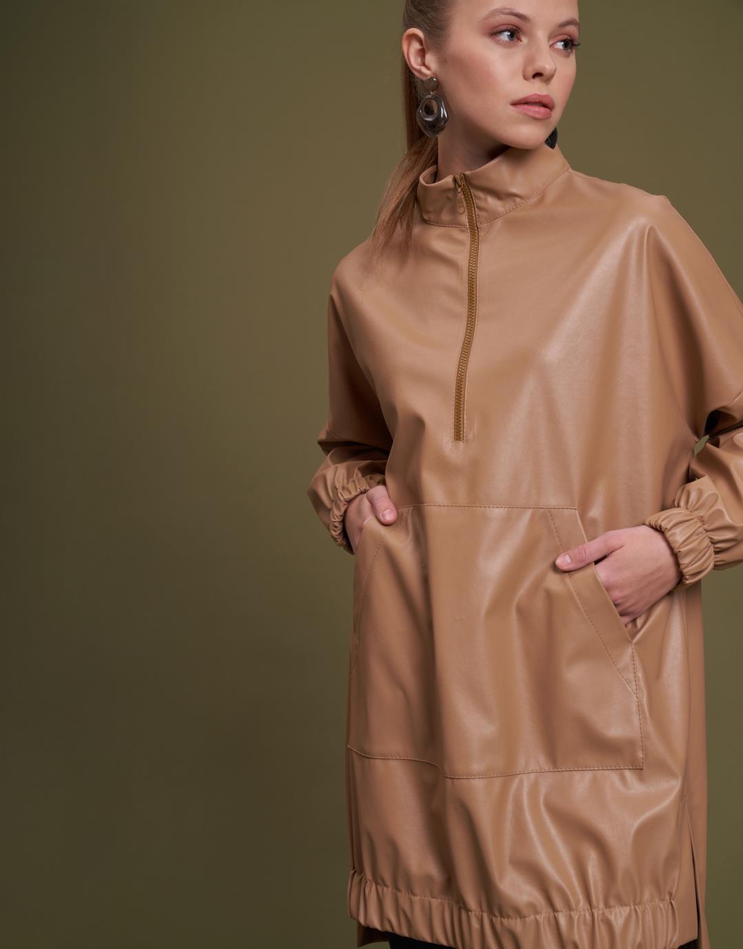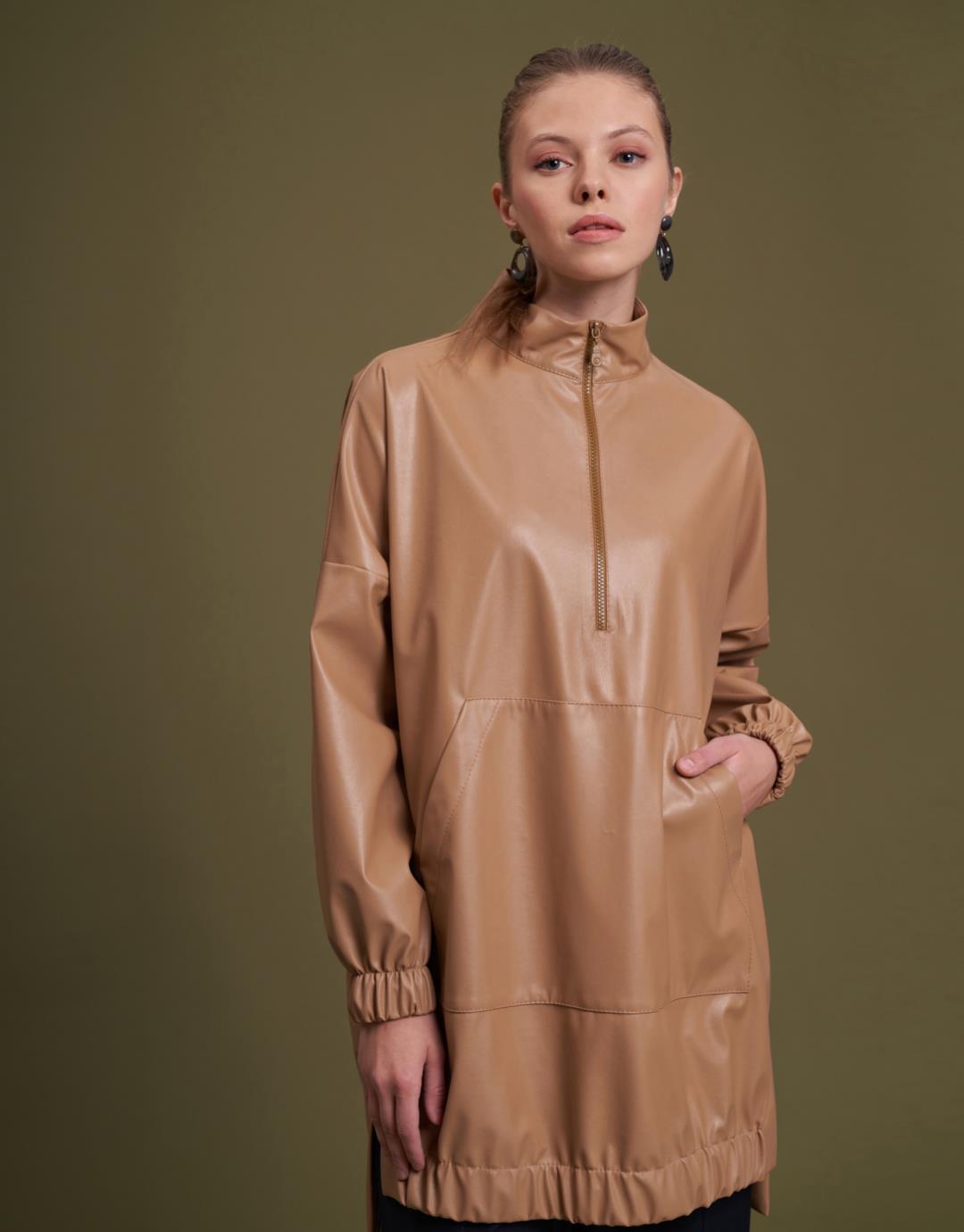 Kangaroo Pocket Faux Leather Tunic – Tan – 11088