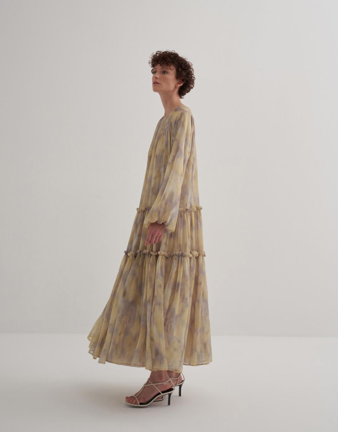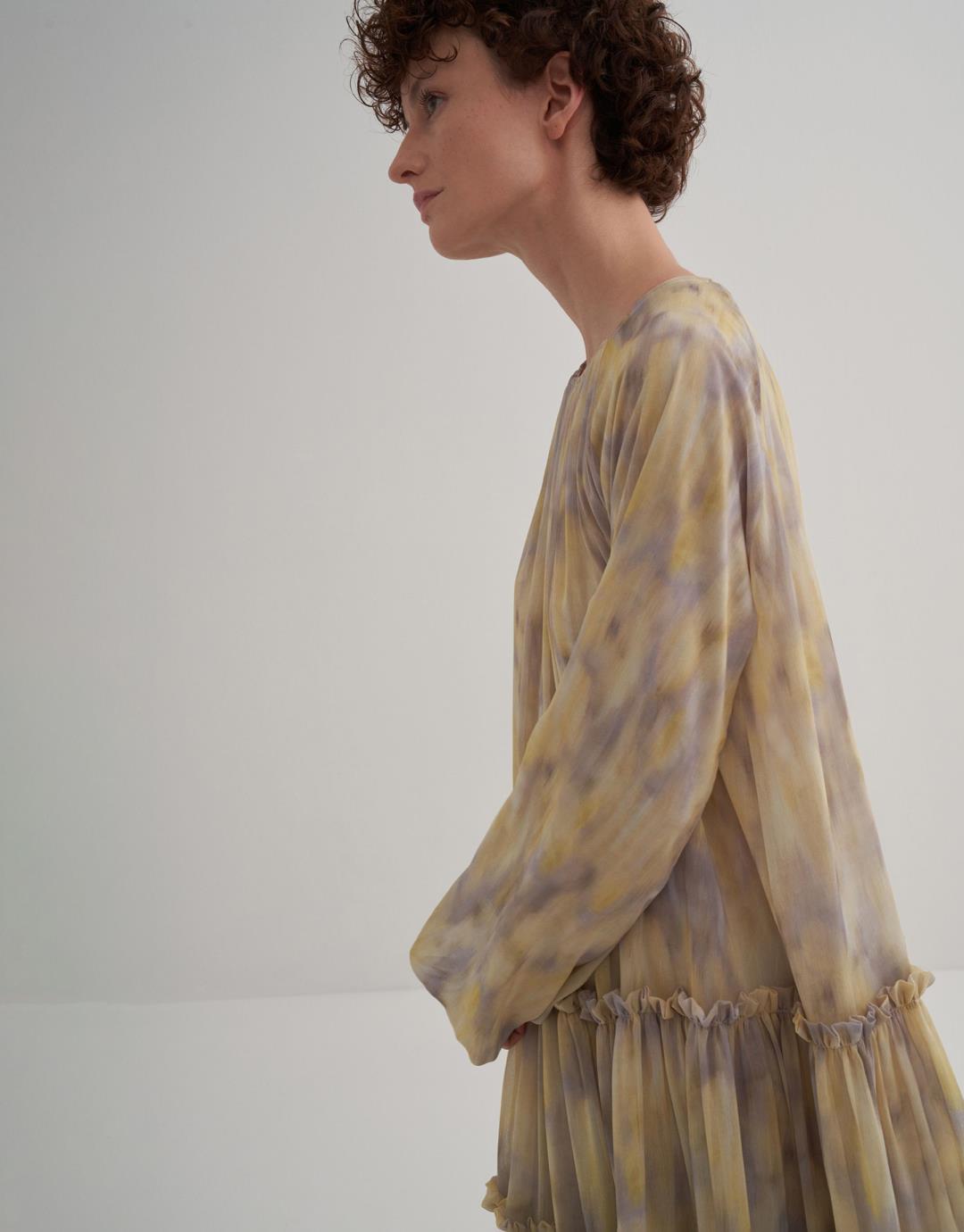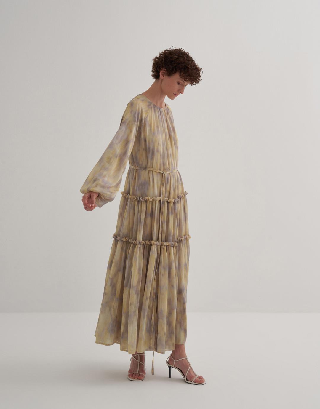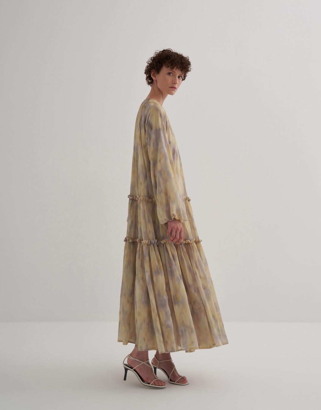 Fabric Content: 100% PES Product Details: Zipper closure at the back. Sleeve detail with smocking detail. Gathering the skirt with layers of ruffles. Lined. Model Size: 36 Model Height: 1.72 The product on the model is size 36. Usage and Washing Instructions: Tetrachlorethylene Dry Cleaning. Roller cleaning is not done. Tumble drying is not done. Bleach bleach is not used.