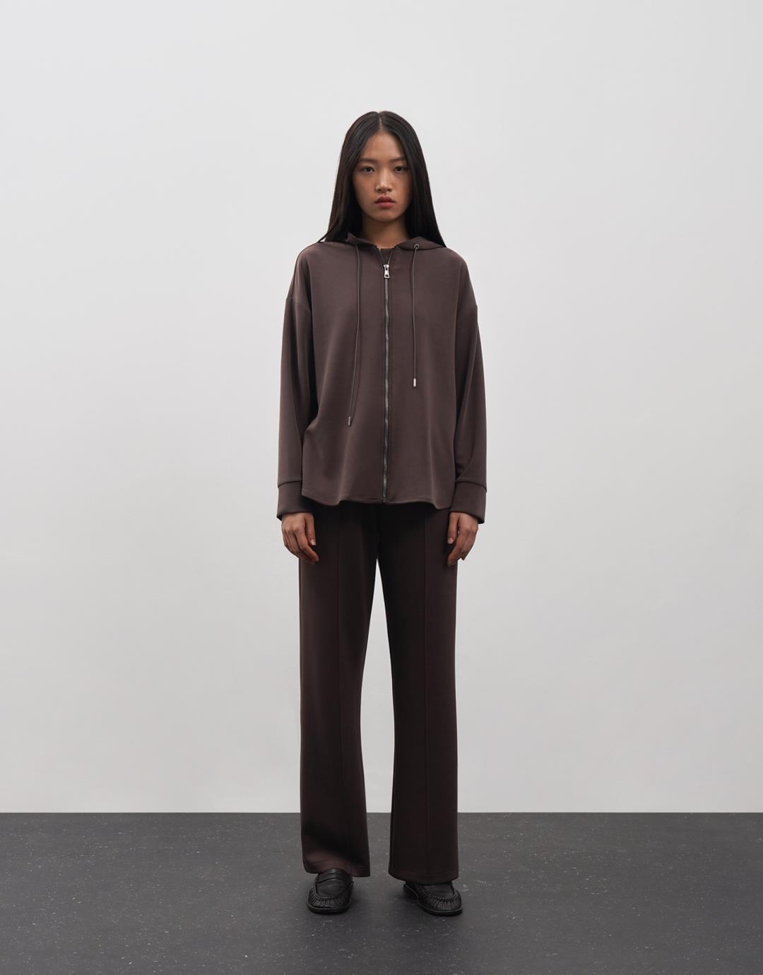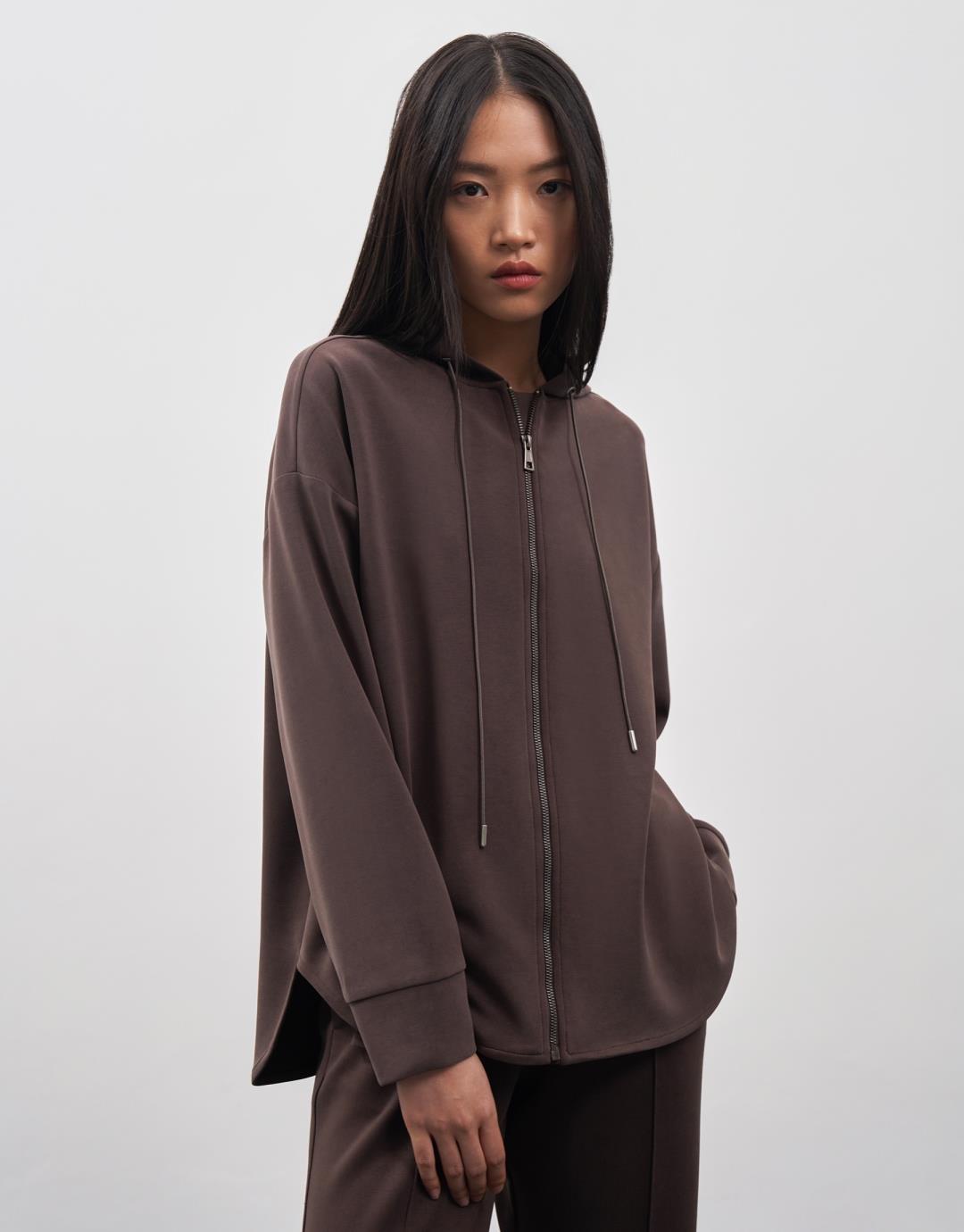 Fabric Content: 50% MOD 44% PES 6% EA Product Details: Hooded. Zipper closure in front. Ribbed cuffs. Model Size: 36 Model Height: 1.78 The product on the model is Size 36. Usage and Washing Instructions: Tetrachloroethylene Dry Cleaning. Roller cleaning is not allowed. Tumble drying is not allowed. Bleach and whitener is not used.