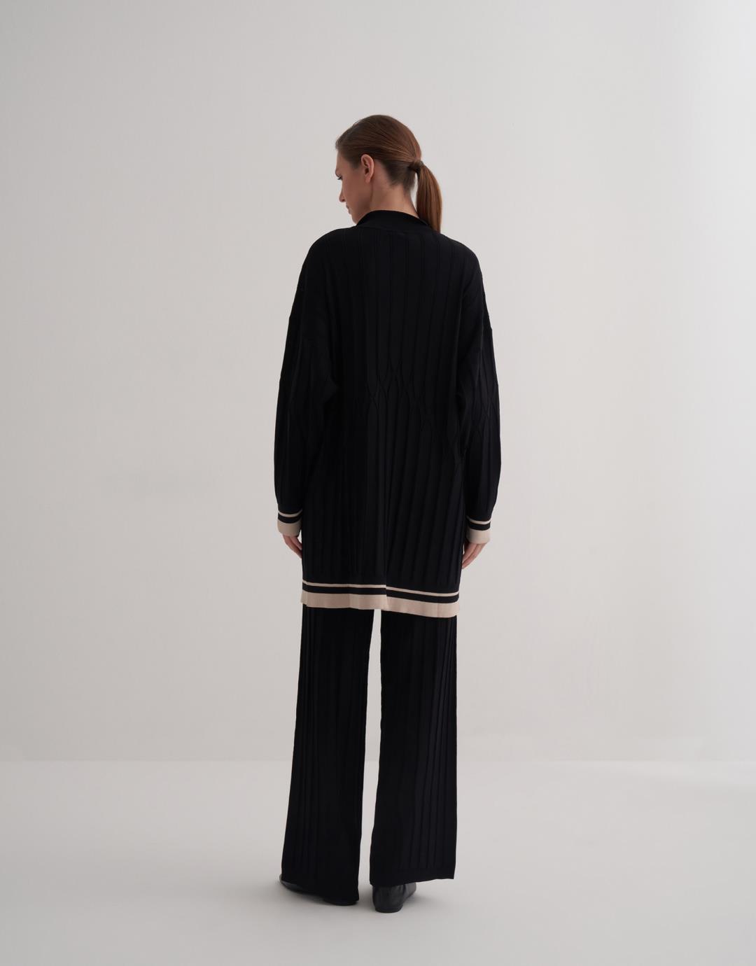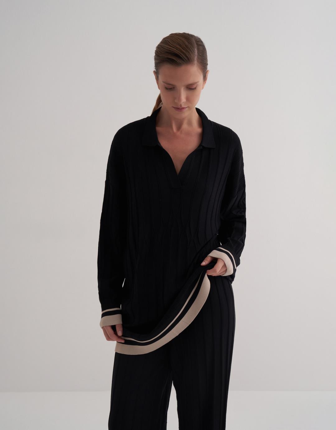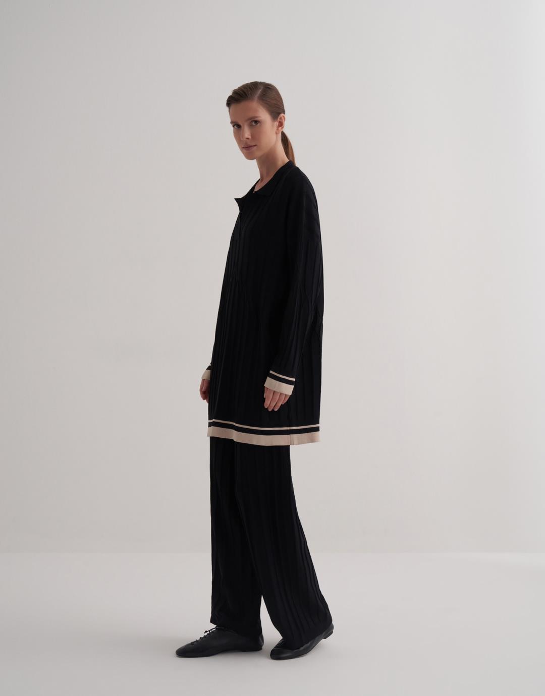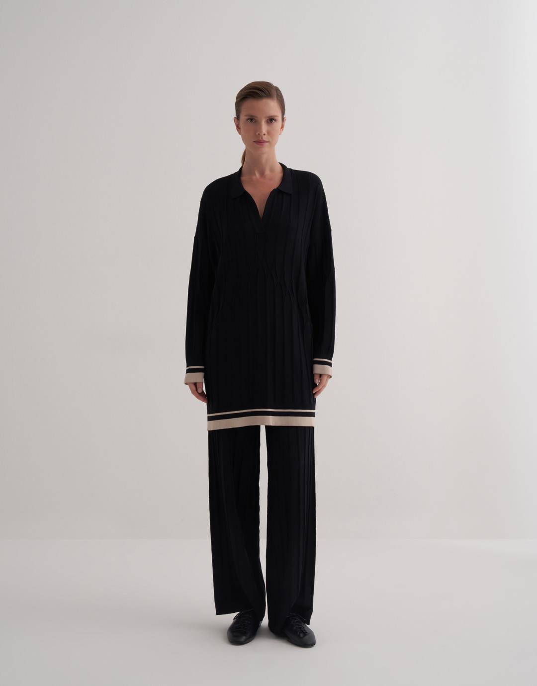 Fabric Content: 65% RAYON 35% NYLON Product Details: Elastic waist, loose-fitting trousers. Polo collar long-sleeved blouse. Model Body: 36 Model Height: 1.78 The product on the model is S/M Size. Usage and Washing Instructions: Tetrachloroethylene Dry Cleaning. Roller cleaning is not done. Tumble drying is not done. Bleach and whitener is not used.