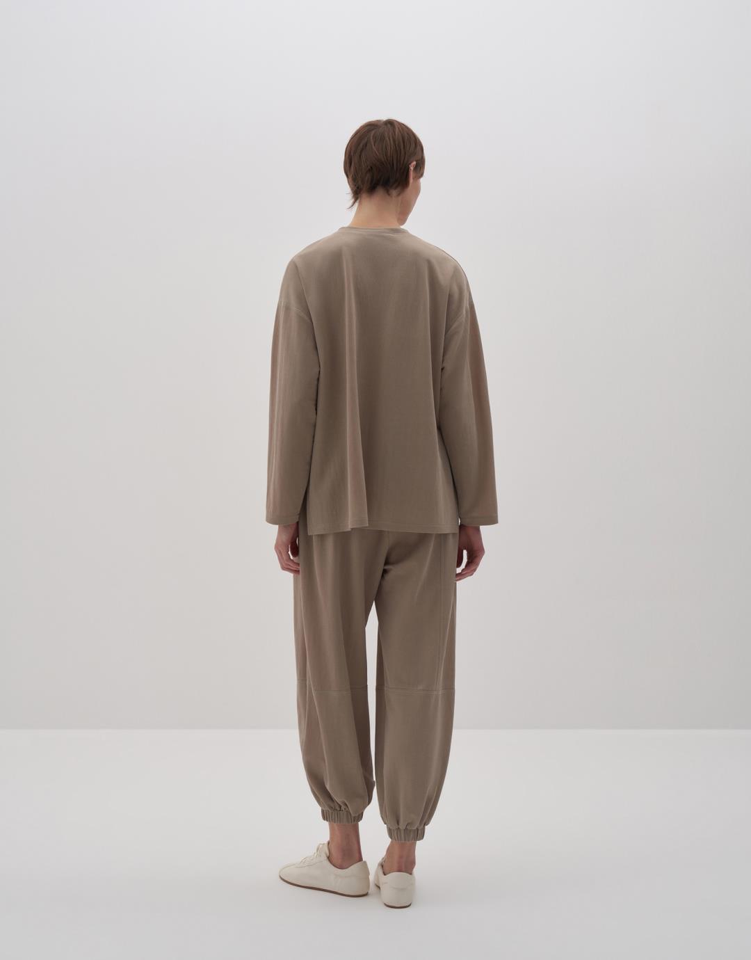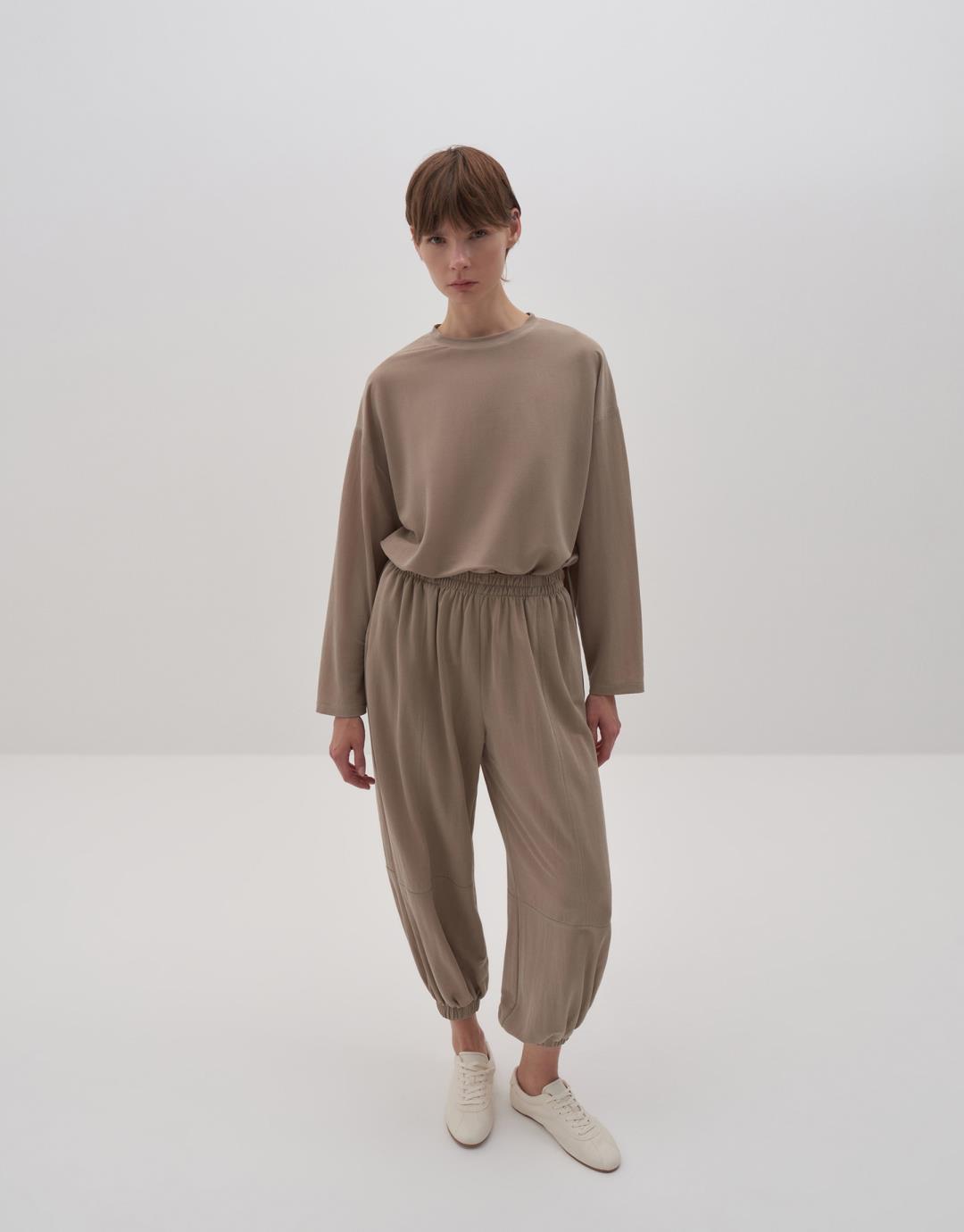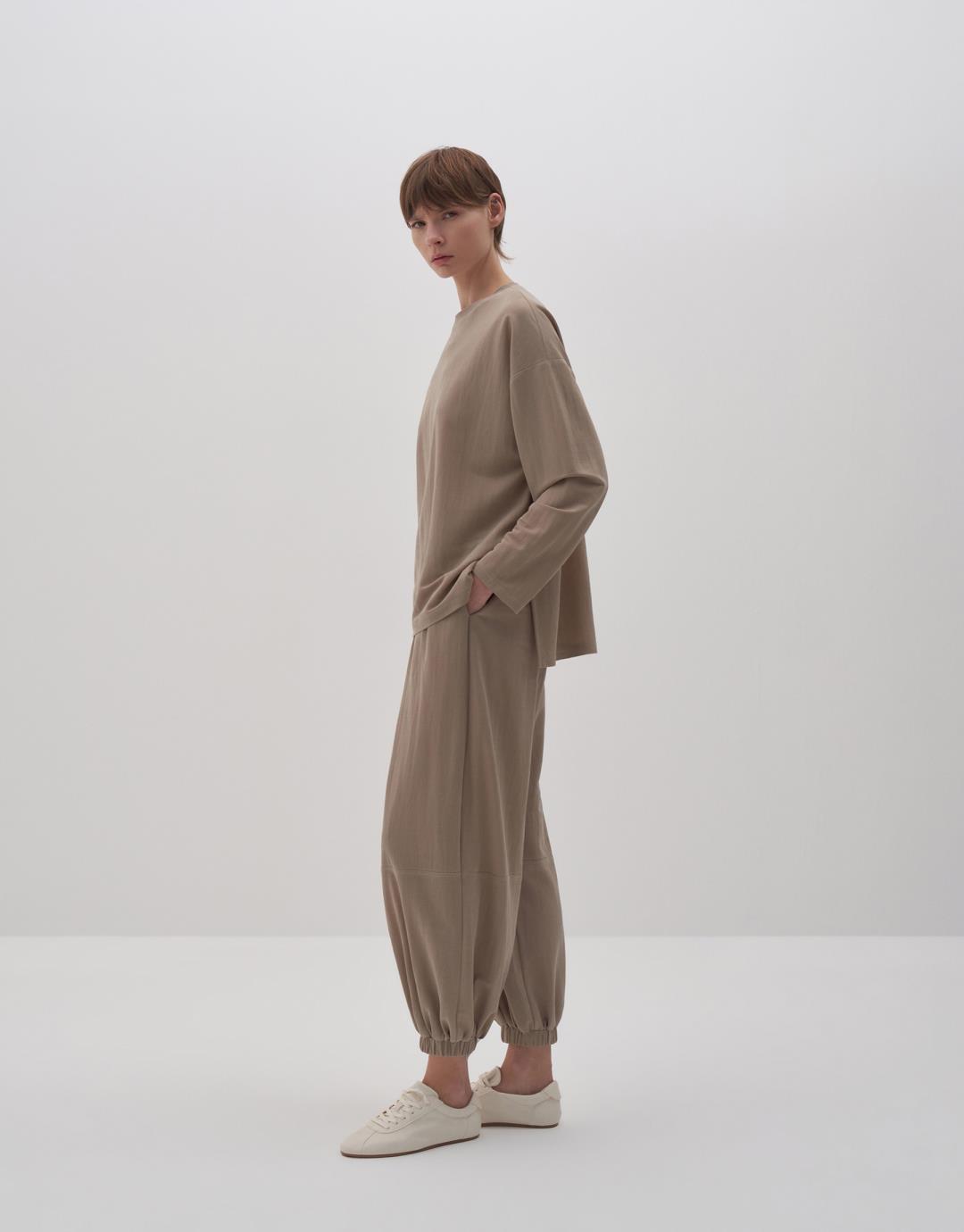 Fabric Content: 57% RAYON 43% NYLON Product Details UPPER: Loose fit. Crew neck. Side seam slit. LOWER: Loose fit. Longitudinal and transverse stitching detail. Waist and leg elastic drawstring. Two side pockets. Model Size: 36 Model Height: 1.78 The product on the model is Size 36. Usage and Washing Instructions: Tetrachloroethylene Dry Cleaning. Roller cleaning is not allowed. Tumble drying is not allowed. Bleach and bleach are not used.