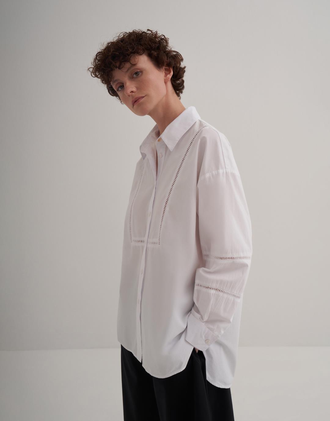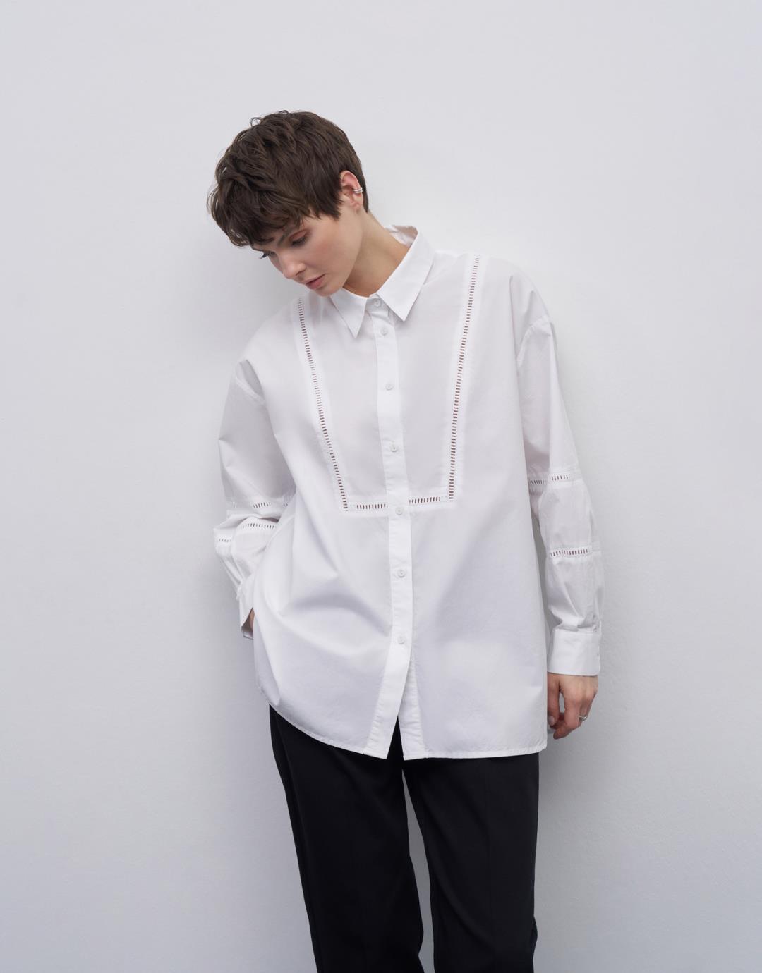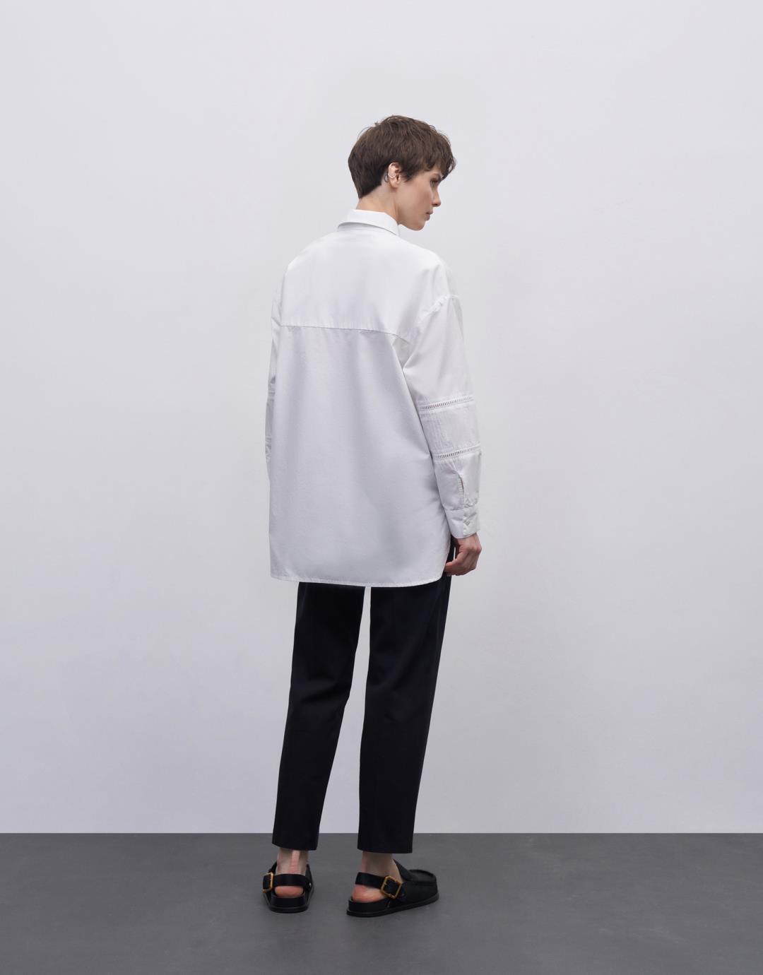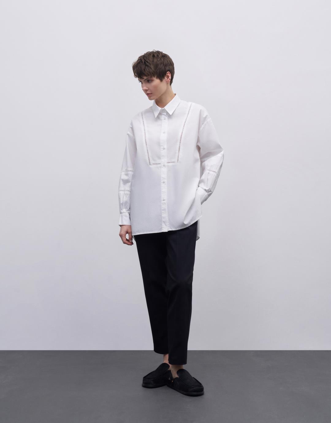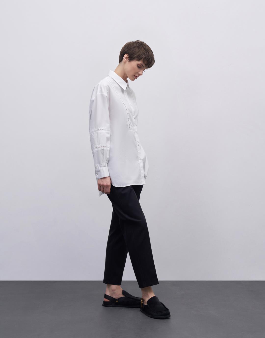 Fabric Content: 100% COTTON Product Details:  Front button closure. Front yoke and sleeve with ribbon scallop detail. The back body has a yoke. Model Size: 36 Model Height: 1.72 The product on the model is size 36. Usage and Washing Instructions: Tetrachlorethylene Dry Cleaning. Roller cleaning is not possible. Tumble drying is not done. Bleach bleach is not used.