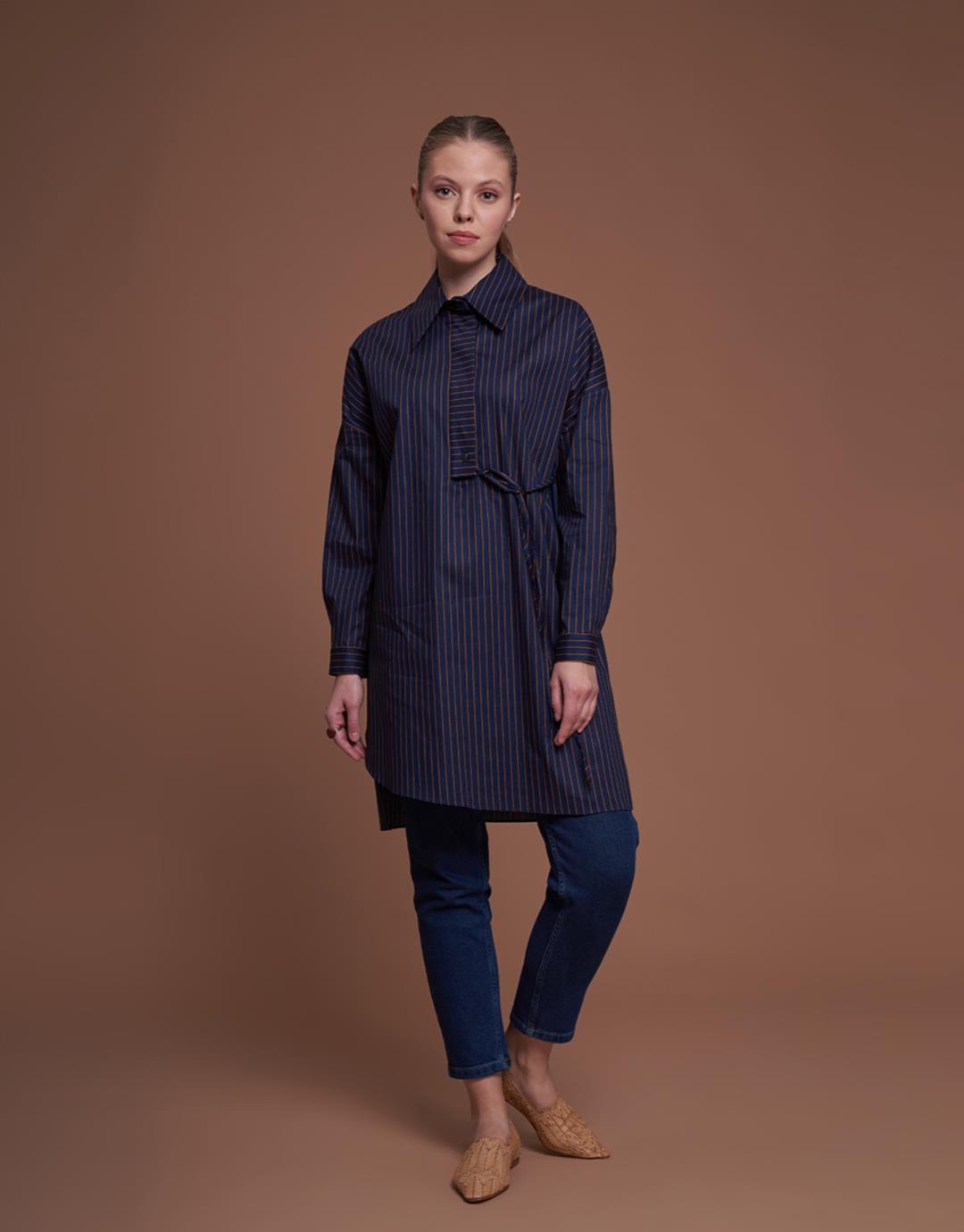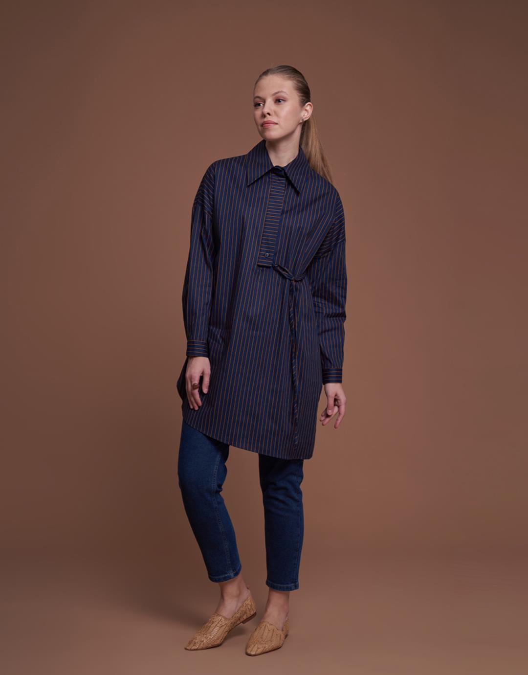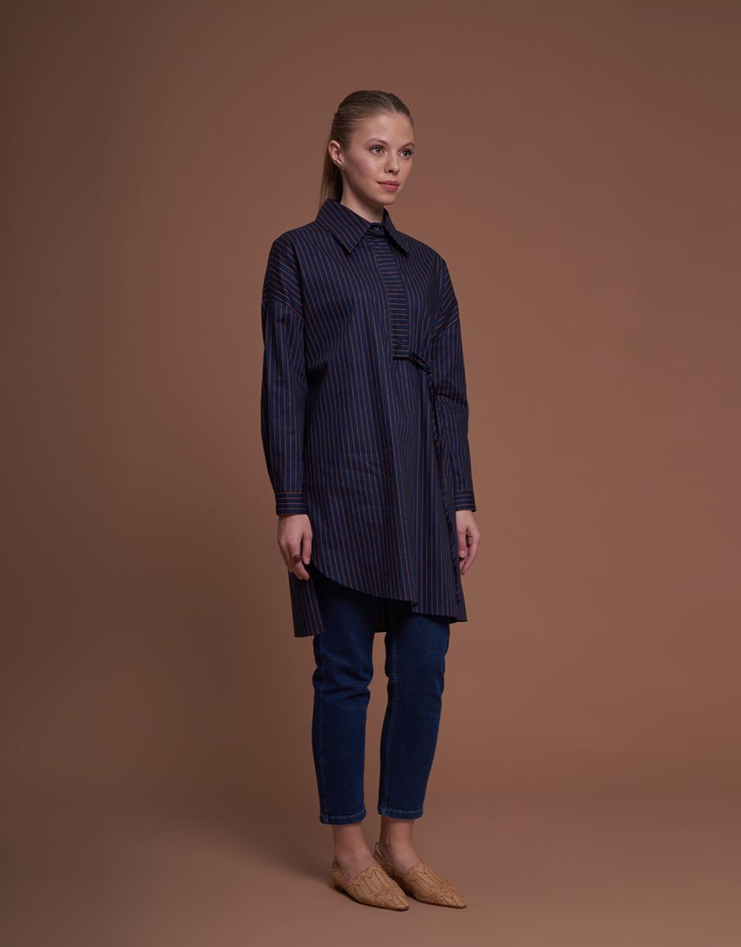 Home2020 Fall / WinterSide Tie Striped Cotton Line Shirt – Navy Blue – 1087 Side Tie Striped Cotton Line Shirt – Navy Blue – 1087 Category: 2020 Fall / Winter Product ID: 23295 Description Description Sample Size : 1 Fabric Information : 97% Cotton 3% Elestane Usage and Washing Instructions : Recommended Dry clean.