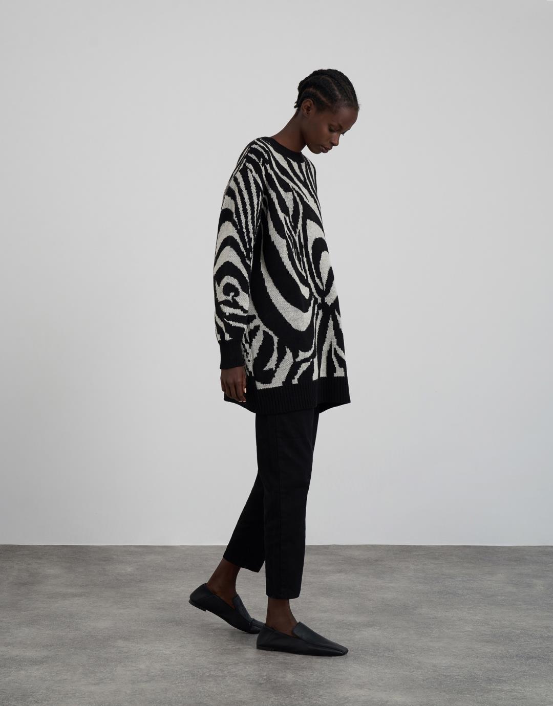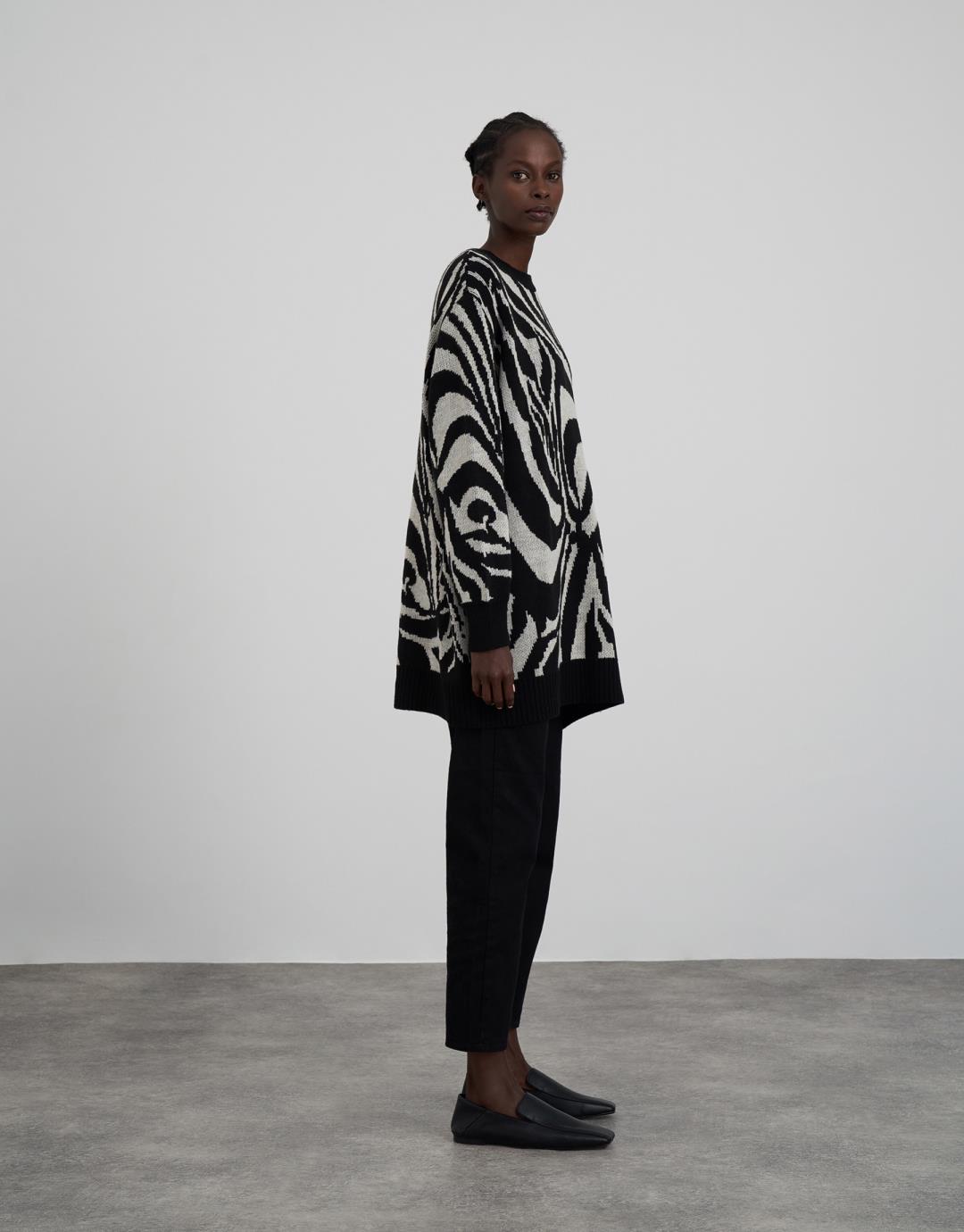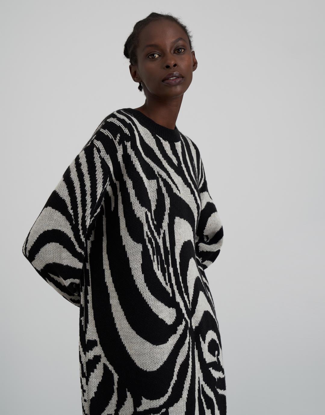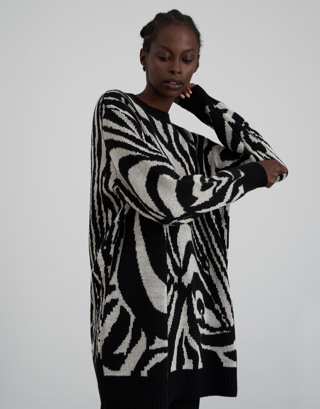 Fabric Content: 50 % acrylic 50 % cotton Fabric Info: Knitted Sleeve Detail Long sleeve Product Details: Crew neck, zebra pattern Mould Information: Loose Model Size : 36 Model Height : 1.78 The product on the Model is standard size. Usage and Washing Instructions : Recommended Dry cleaning.