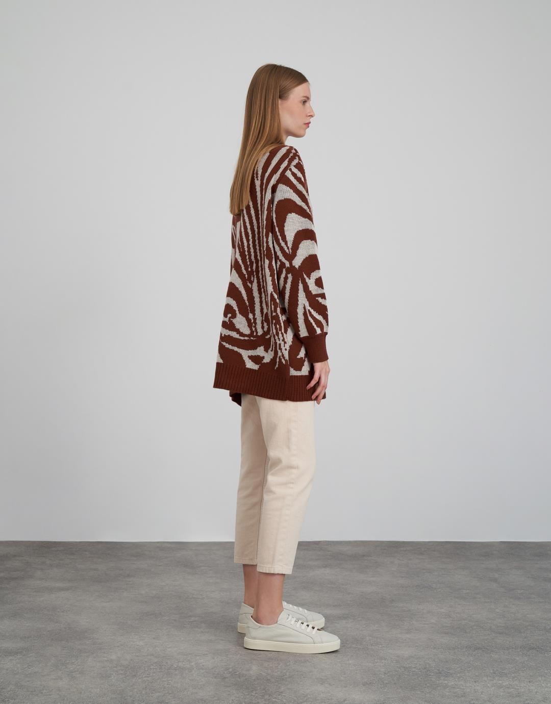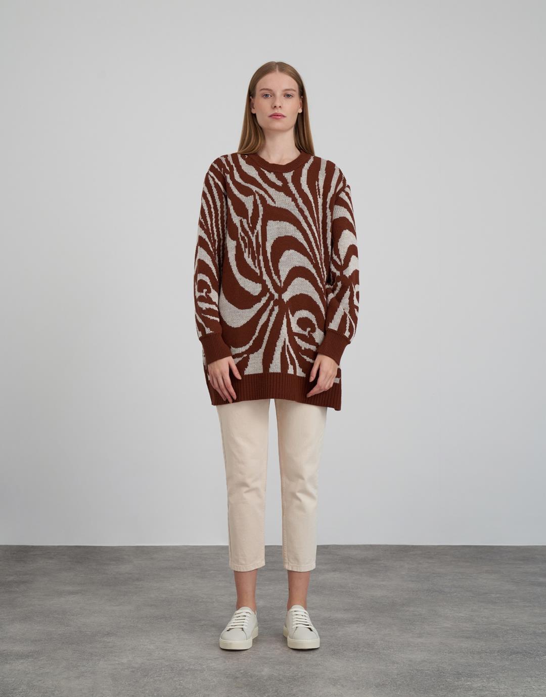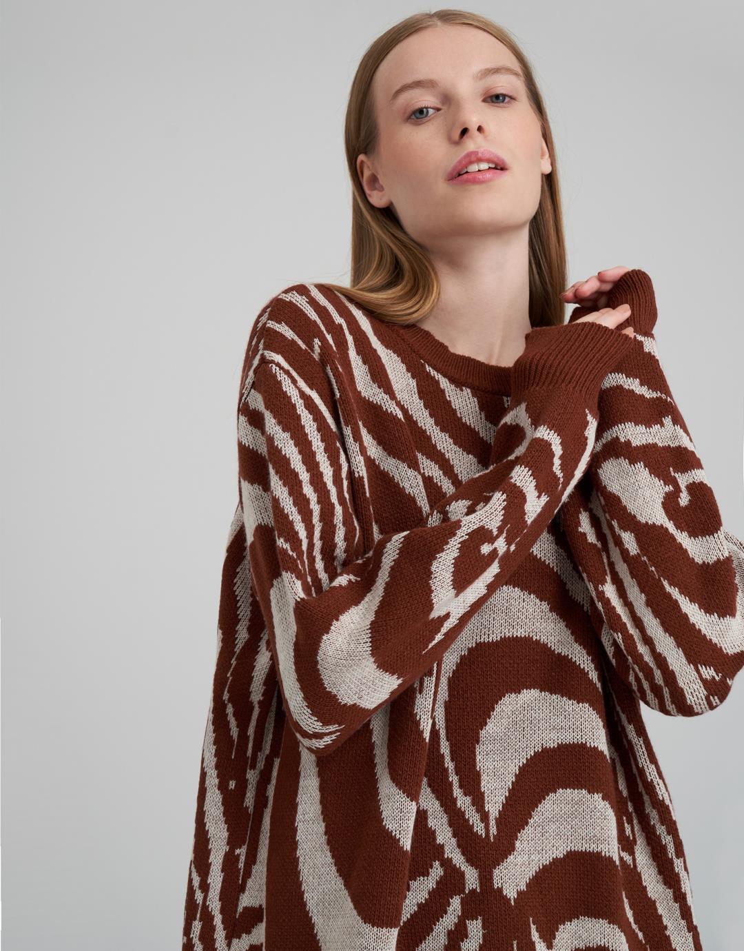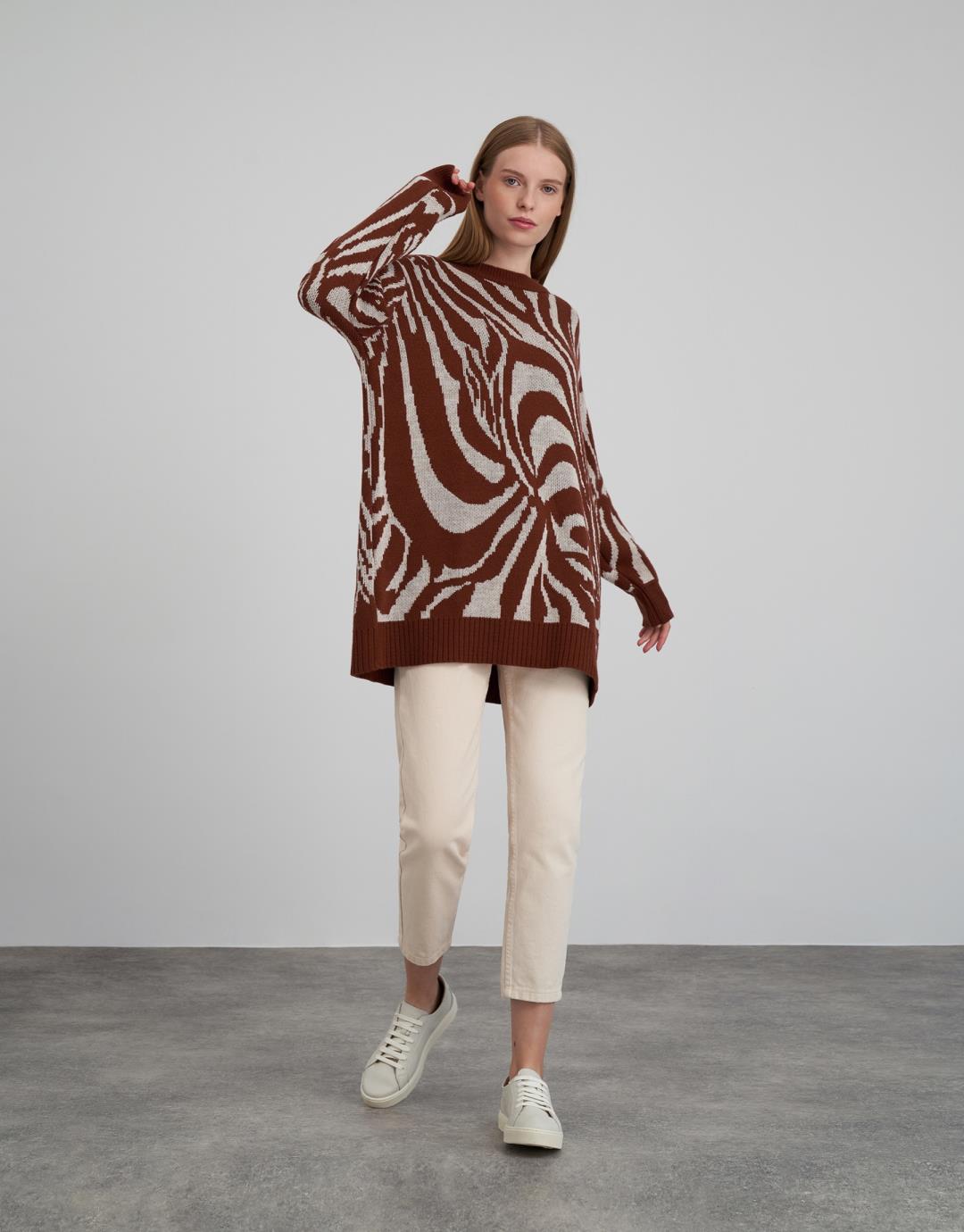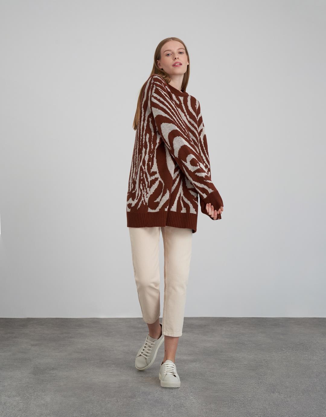 Fabric Content: 50 % acrylic 50 % cotton Fabric Info: Knitted Sleeve Detail Long sleeve Product Details: Crew neck, zebra pattern Mould Information: Loose Model Size : 36 Model Height : 1.78 The product on the Model is standard size. Usage and Washing Instructions : Recommended Dry cleaning.