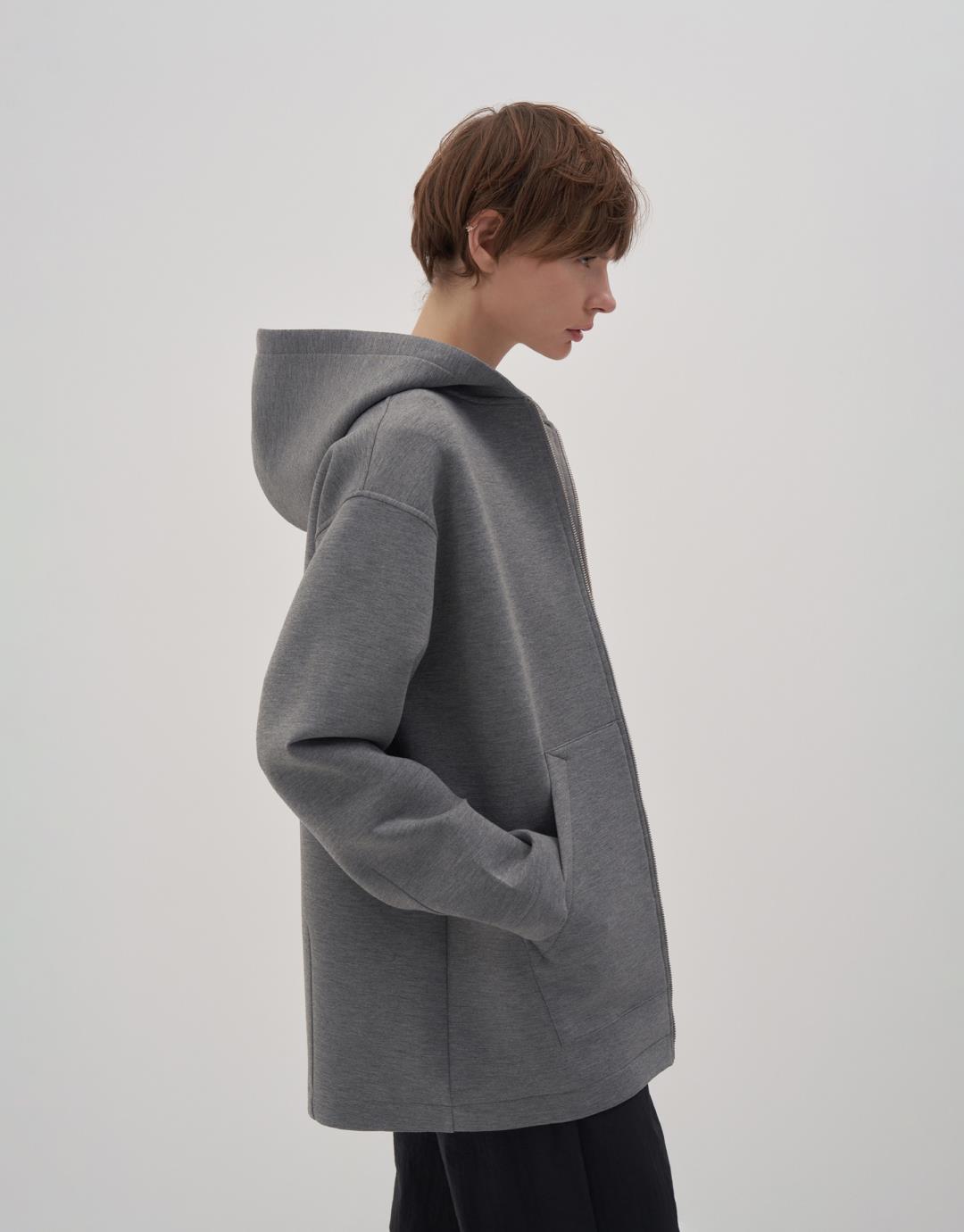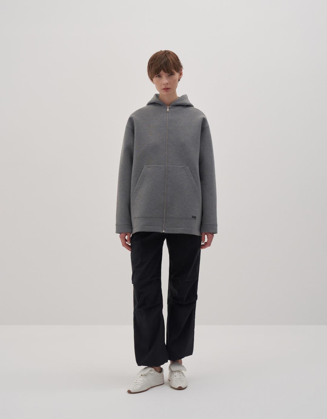 Fabric Content: 76% PES 20% VIS 4% LYC Product Details: Hooded. Long sleeves. Cuffed. Kangaroo pocket. Metal zipper closure on the front. Model Size: 36 Model Height: 1.78 The product on the model is Size 36. Usage and Washing Instructions: Tetrachloroethylene Dry Cleaning. Roller cleaning is not allowed. Tumble drying is not allowed. Bleach bleach is not used.