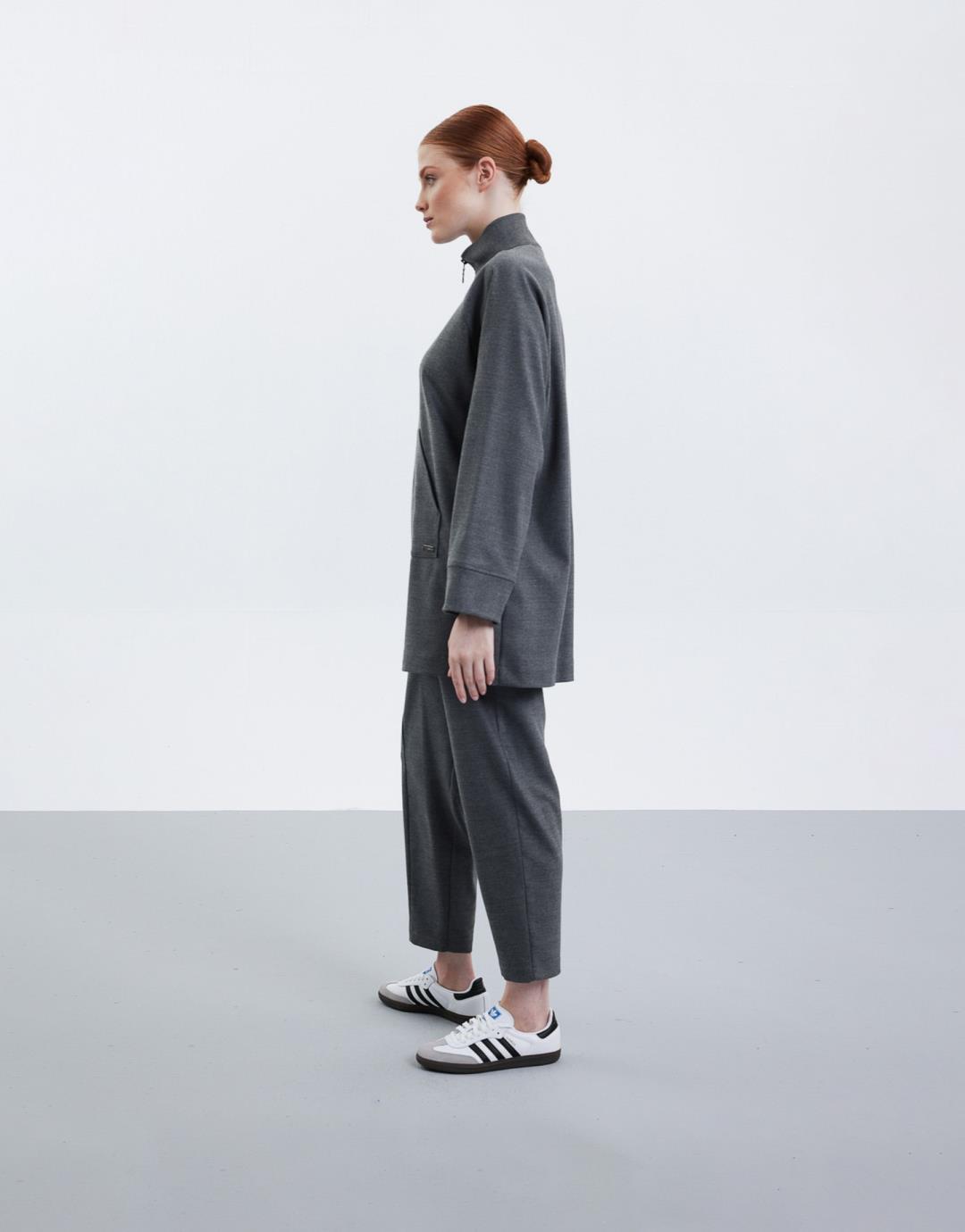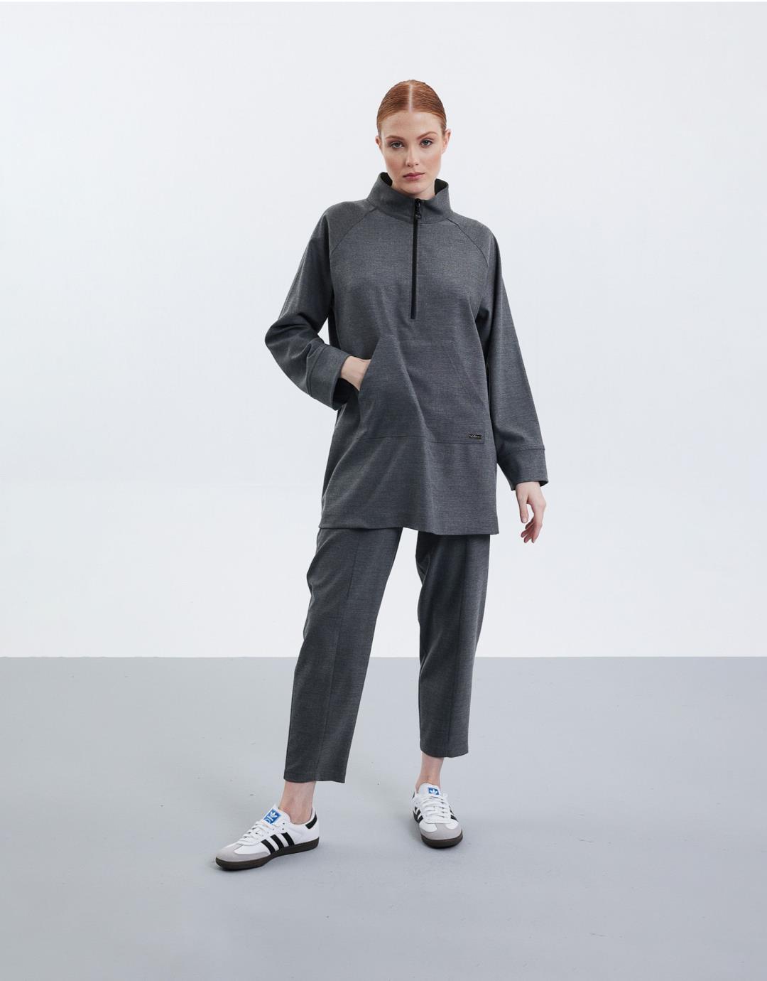 Fabric Content: 63%PES 33%VIS 4%LYCRA Product Details: Raglan Sleeve, Kangaroo Pocket, Front Zippered Collar. The trousers have 2 pockets, elastic at the back of the waist and a side zipper. Model Size: 36 Model Height: 1.74 The product on the model is size 36. Usage and Washing Instructions: – Wash at max. 30°C. – Iron at low temperature. – Tumble drying is not done. – Bleach is not used. – Dry cleanable. – Do not use with metal accessories. – It is a sensitive product.